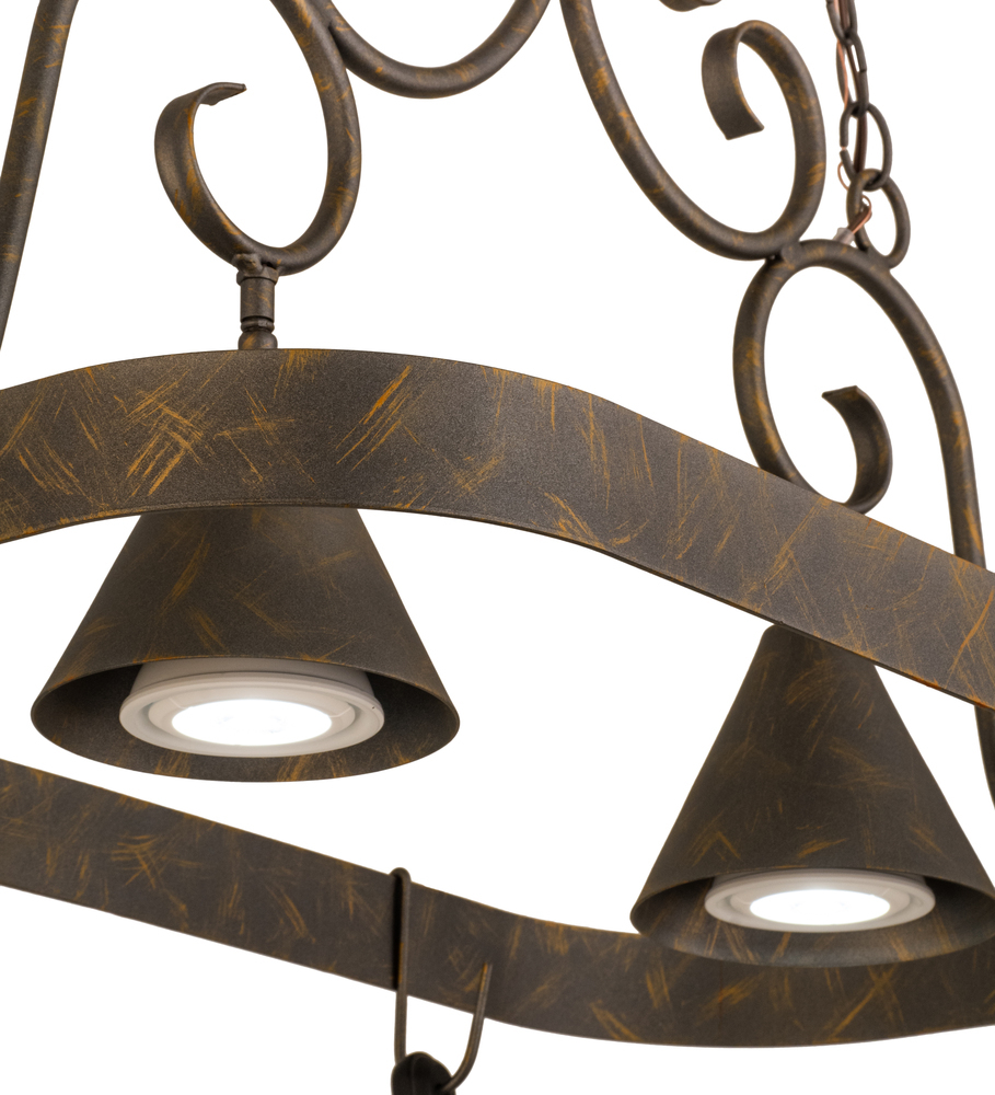 An upscale design that integrates form and function; Elana is highlighted with large scroll accents and a French Bronze finished frame with hooks to display fine cookware for easy access in kitchens. Two luminaires provide optimal downlighting to illuminate counter surfaces; tabletops; islands and architectural accents. Handcrafted in the USA by our highly skilled artisans; this fixture is available in custom sizes; styles; colors and energy-efficient lamping options.