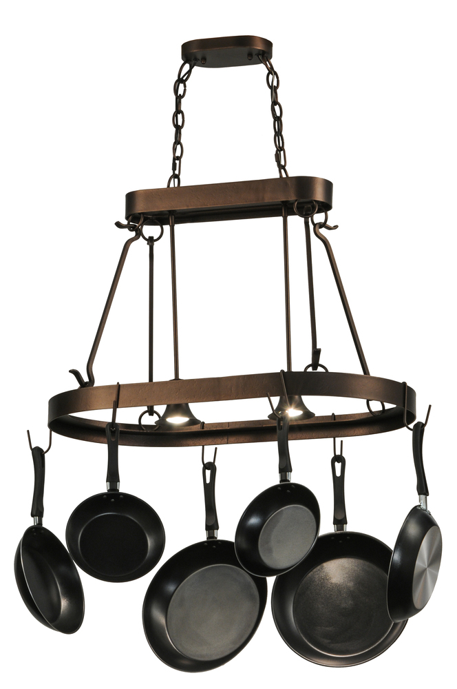 Rustic charm marries functional elegance with the Harmony Lighted Pot Rack. The functional oval-shaped lighted fixture features Mahogany Bronze finished hardware which is enhanced with hooks to display fine cookware and accessories. Two Medium base downlights deliver functional illumination over kitchen islands and other surfaces. The overall height ranges from 24 to 71 inches as the chain length can be adjusted in the field to accommodate your specific lighting application needs. Handcrafted by highly skilled artisans in our 180;000 square manufacturing facility in Yorkville; New York. Diffuser colors; metal finishes and fixture sizes can be customized. UL and cUL listed for dry and damp locations.