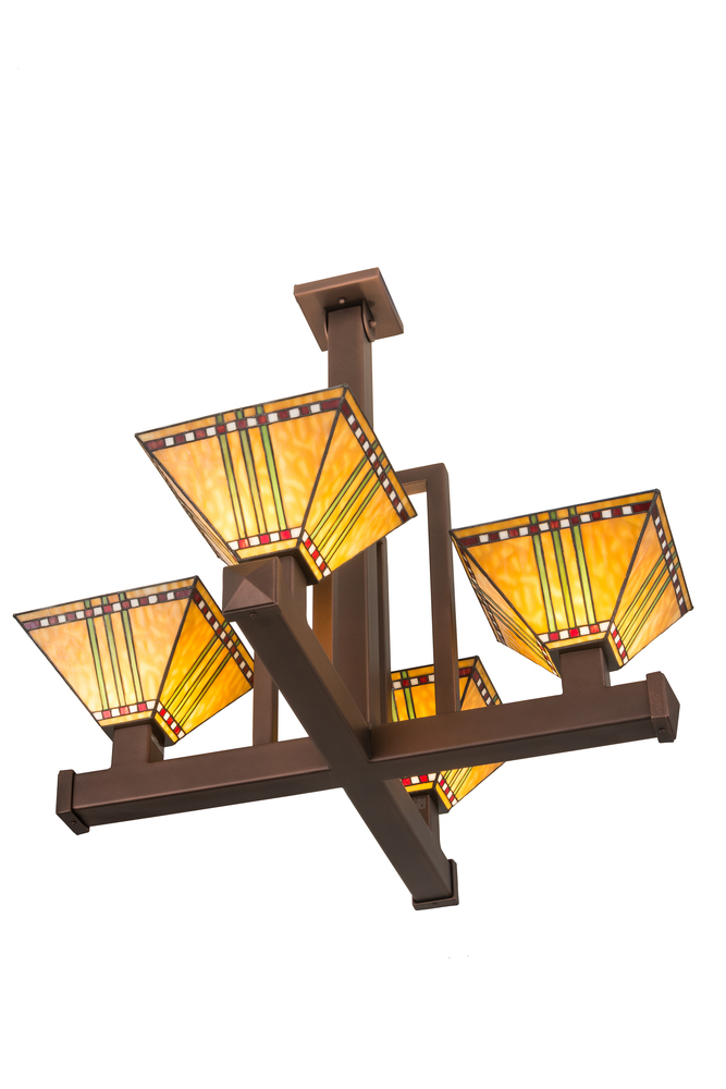 This handsome 3 light island fixture reflects the modestly adorned Bungalow style with Pine Cone accented lantern shades of Beige art glass which are suspended from linear Bronze hardware.