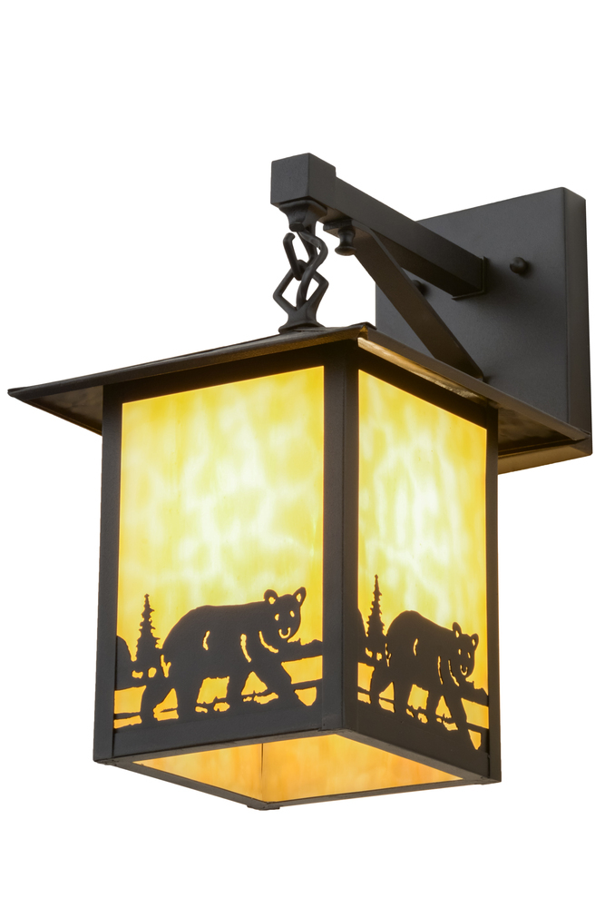 Handcrafted of Solid Brass; a majestic Bear meanders alongside a mountain creek; creating an image that would make Mother Nature proud. Pleasant ambient light projects through Beige art glass; which is complemented with a frame and hardware featured in a Black finish. This wall fixture is custom crafted by Meyda artisans at the foothills of the spectacular Adirondack Mountains; in the USA. Create the colors; size and style of your choice; or choose from our dimmable energy efficient lamping options.