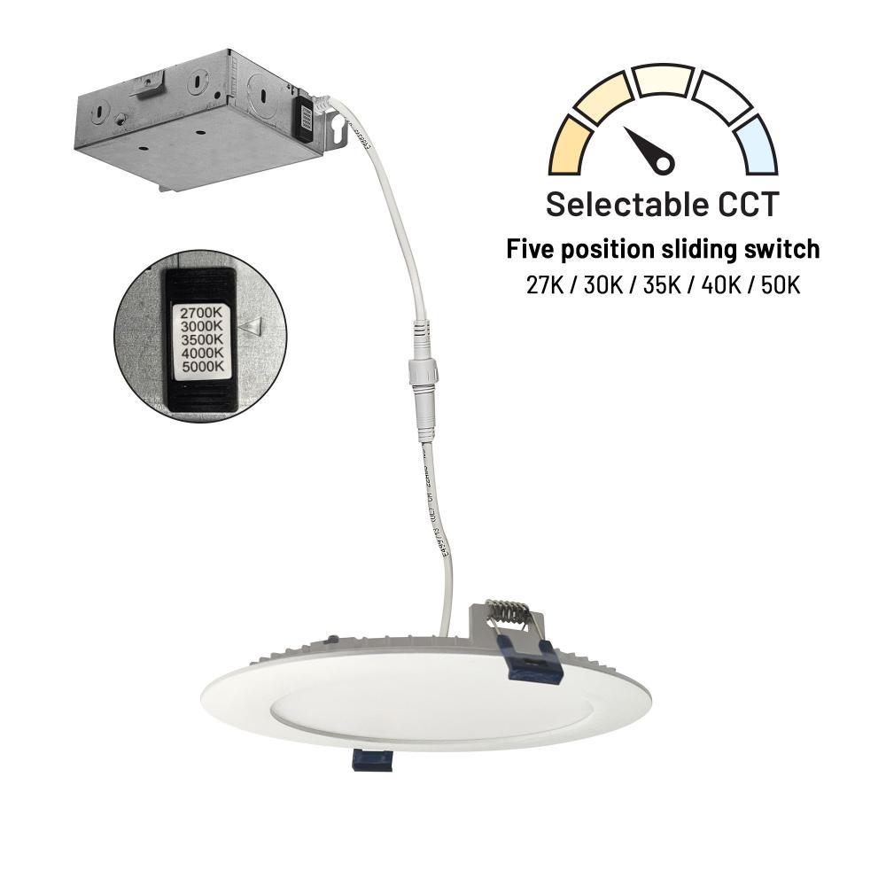 6" Flat wafer can-less LED downlights feature a non-metallic trim for corrosive environments. Can-less downlights are easy to install in new construction or remodel applications. Each luminaire includes a selectable CCT switch located on the junction box with a quick connect that allows for easy disconnect and mounting in the ceiling.