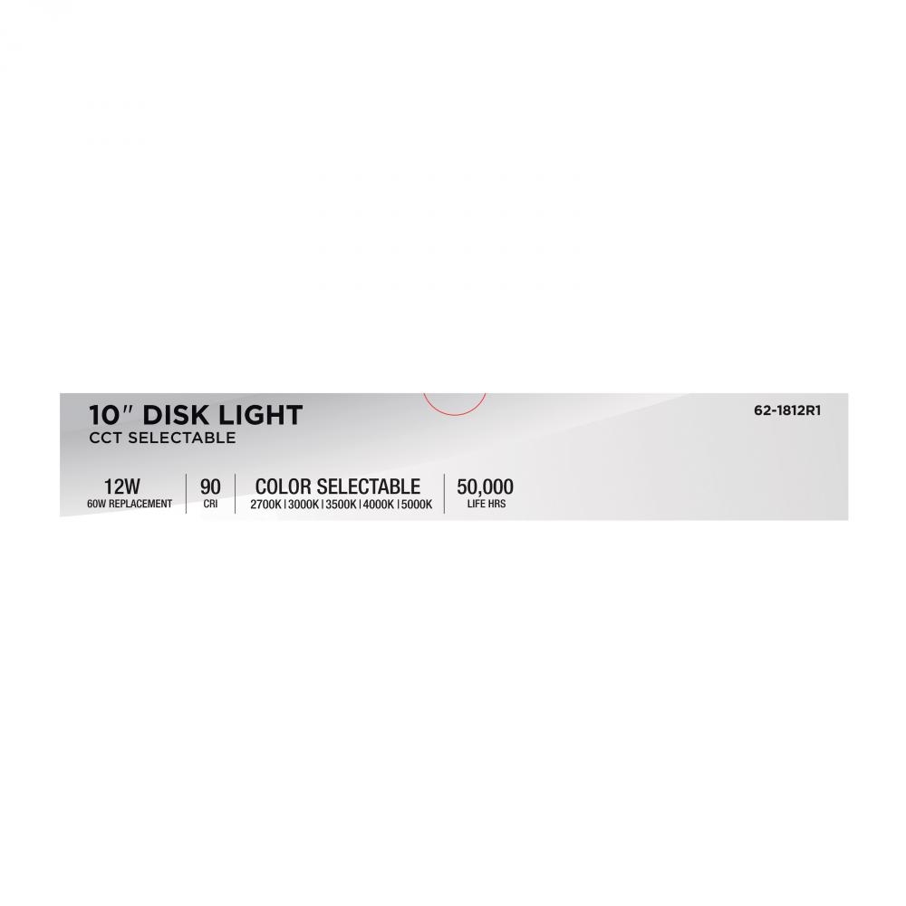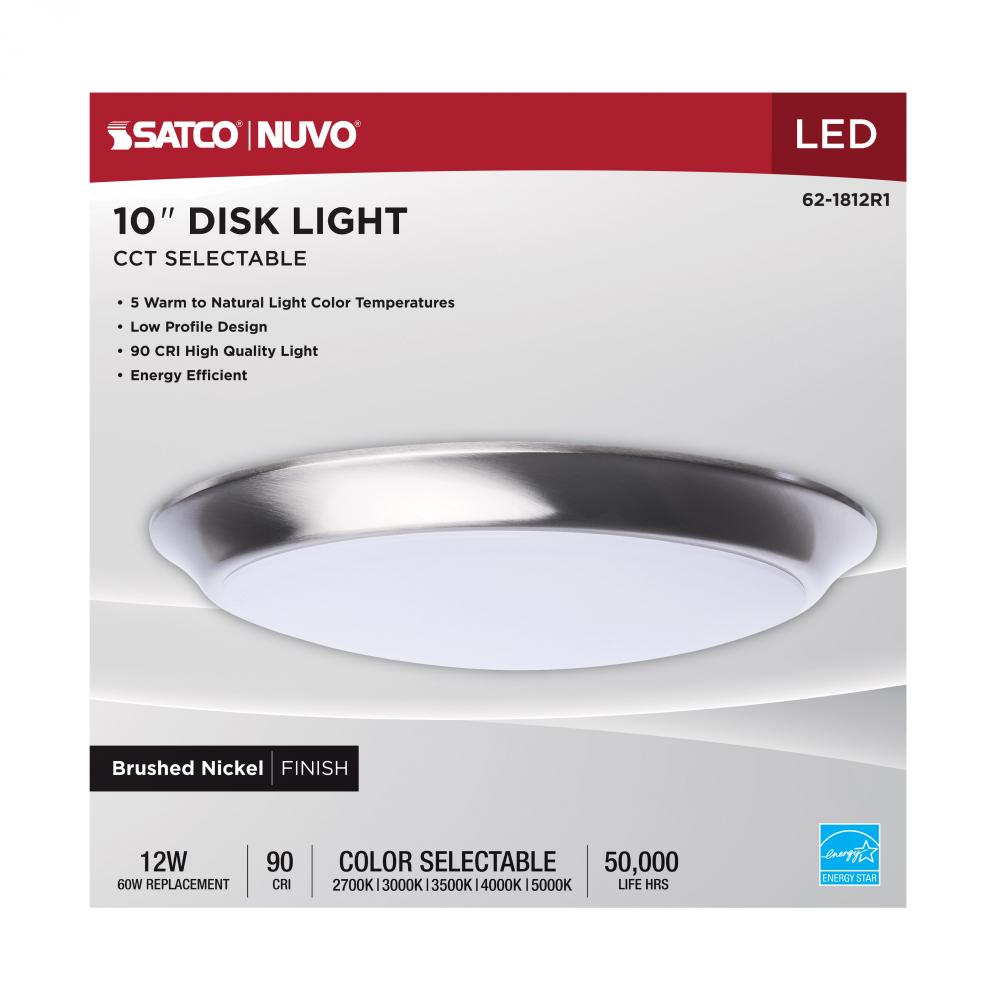 Designed for larger spaces, SATCO NUVO's 62-1812R1, 10" CCT Selectable Disk Light in a brushed nickel finish delivers powerful, customizable illumination with a sleek, low-profile look. Consuming just 12 watts, this high-performance fixture feature