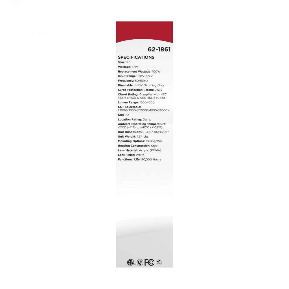 The SATCO NUVO 62-1861, 14-inch round LED Cloud fixture features 5 CCT selectable technology and a high 90 CRI rating, ensuring exceptional and uniform illumination. It is crafted with a durable, non-yellowing PMMA lens and is rated for damp locations, mak