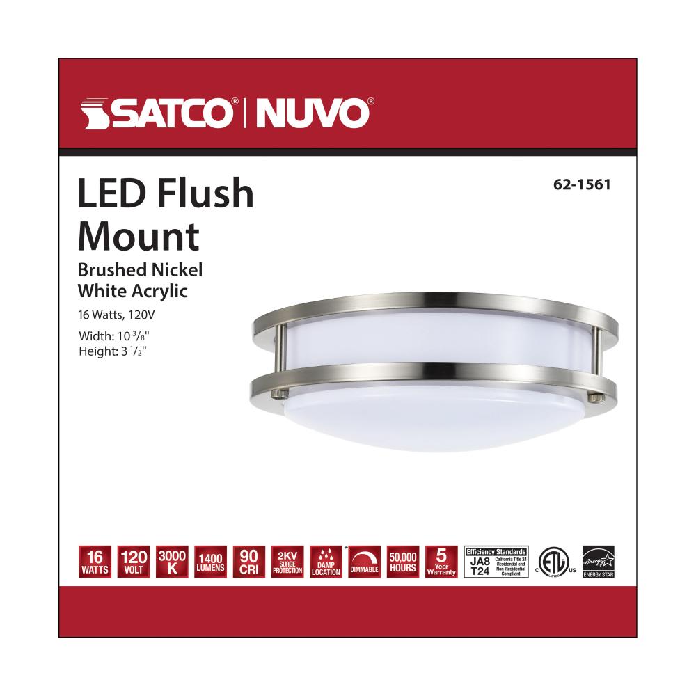 Satco's 62-1561 16-watt, 10 inch flush mount fixture is a streamlined flush mount with contemporary styling. Add illumination to a dark hallway or foyer with this sleek and dimmable flush mount fixture. Finished in brushed nickel with a white lens, thi