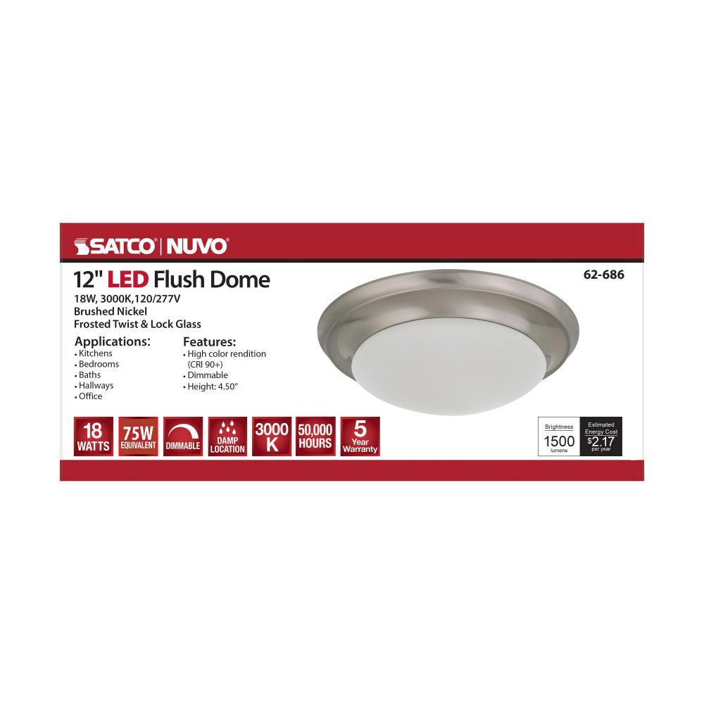 Nuvo's 62-686 18-watt, 12 inch flush mount twist and lock fixture features a brushed nickel finish with frosted glass. Damp rated, this fixture is ideal for illuminating kitchens, hallways, bedrooms, and stairwells in residential and multi-family envir
