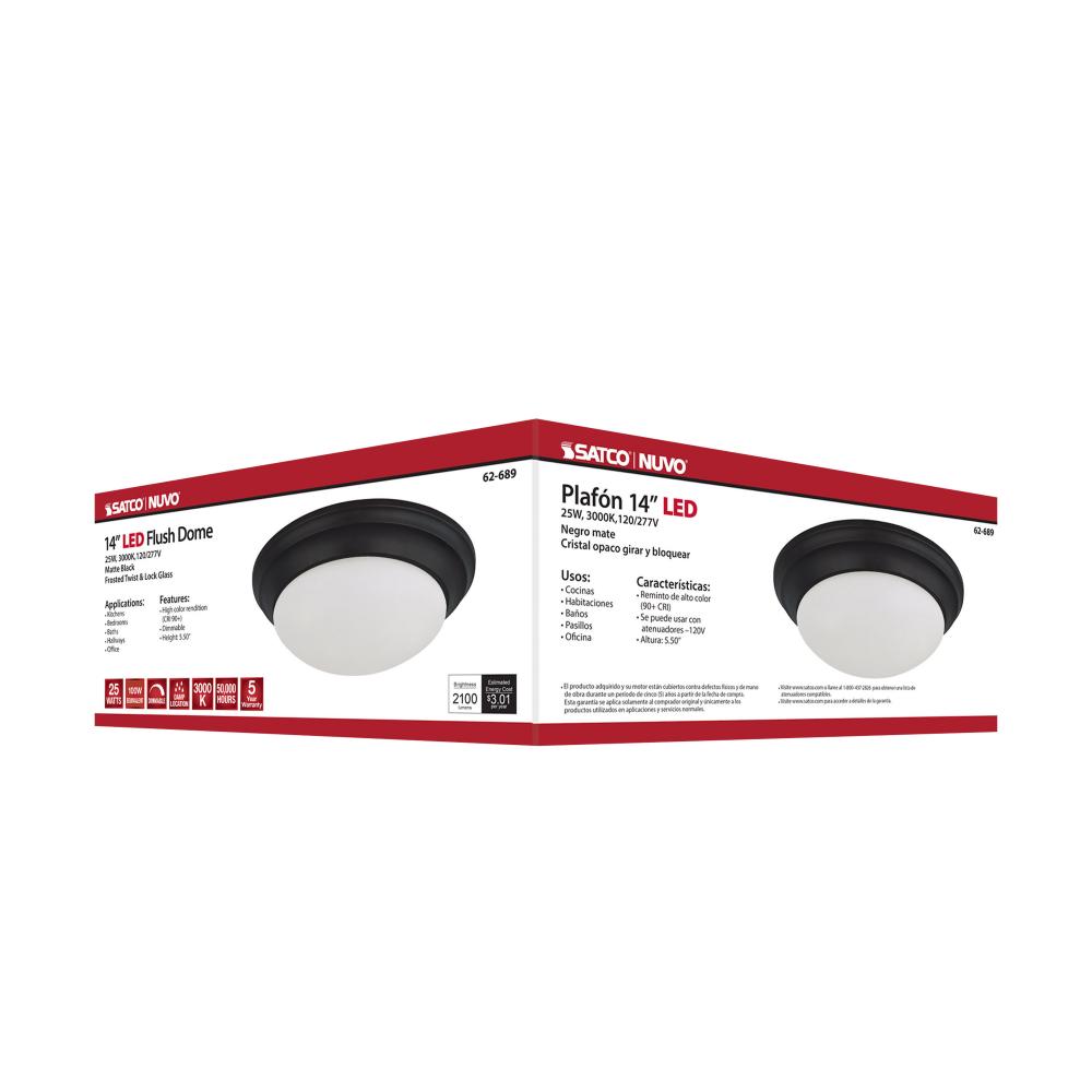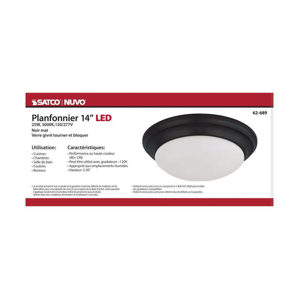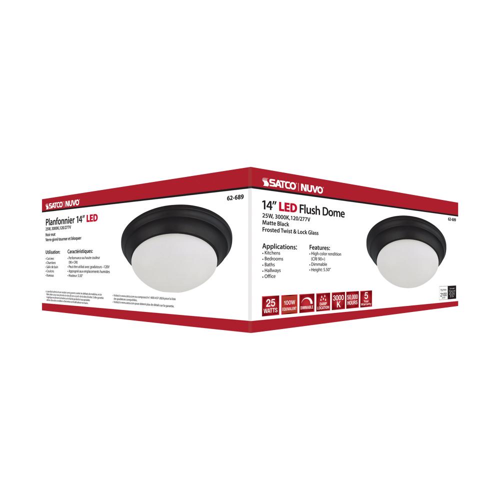 Nuvo's 62-689 25-watt, 14 inch flush mount twist and lock fixture features a matte black finish with frosted glass. Damp rated, this fixture is ideal for illuminating kitchens, hallways, bedrooms, and stairwells in residential and multi-family environm
