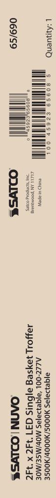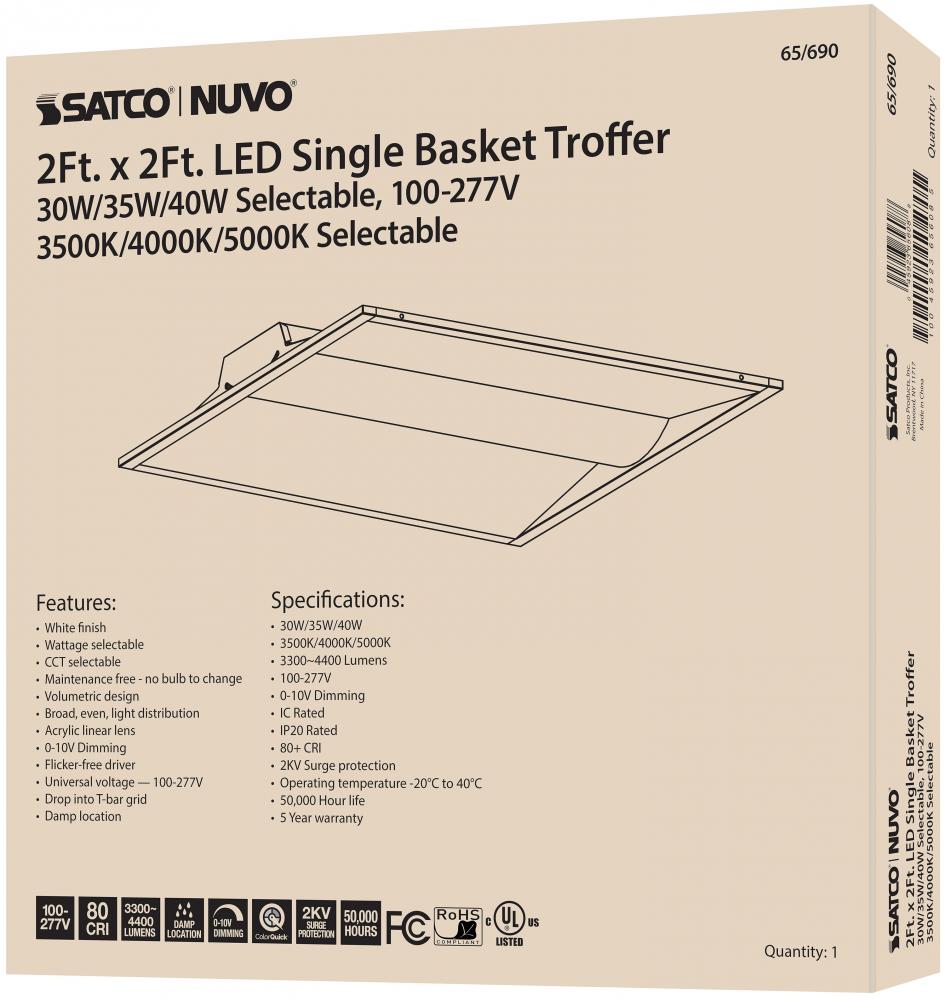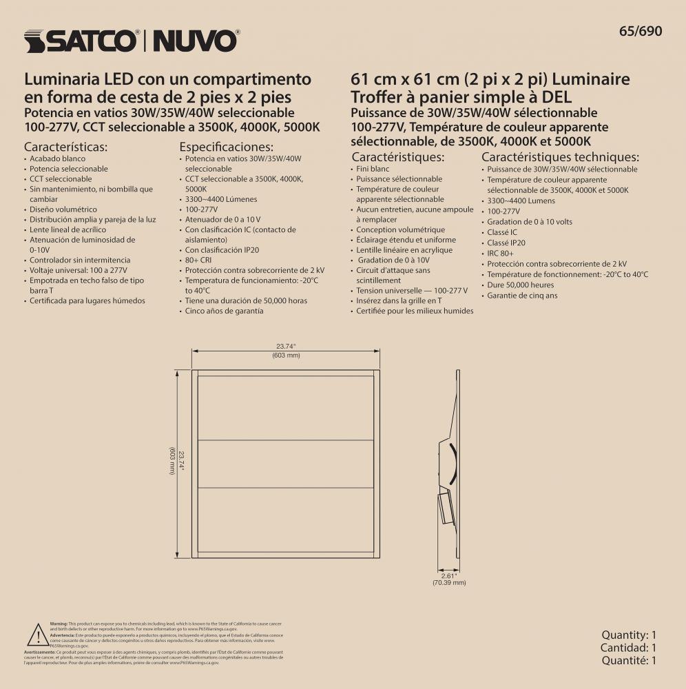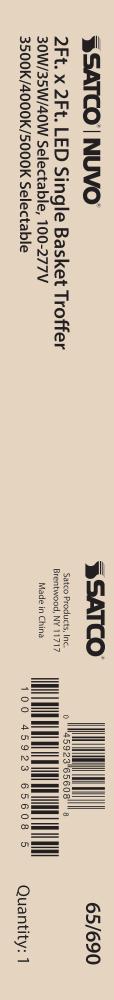 SATCO NUVO's 65-690 is a two foot by two foot single basket troffer which features selectable wattage and color temperature. The troffer features an acrylic linear prismatic lens which allows for broad, even light distribution. The driver allows for fl