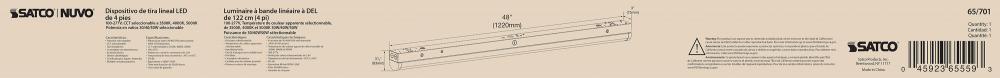 SATCO NUVO's 65-701 4-foot LED Linear Strip Fixture offers adaptable lighting for diverse applications. This field-selectable fixture provides wattage options of 30W, 40W, or 50W and color temperature settings of 3500K, 4000K, or 5000K. With a universa