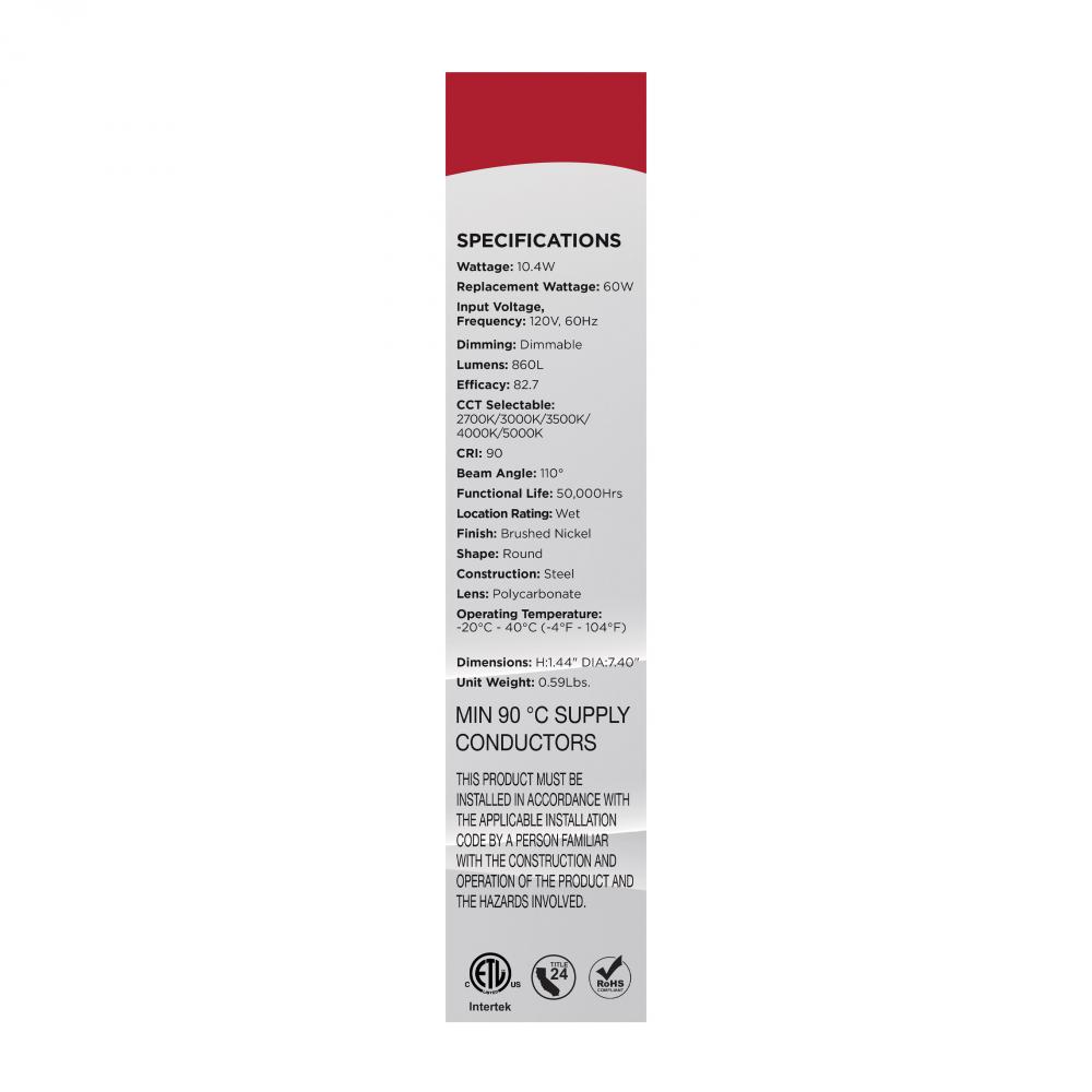 Bring style and performance to your space with SATCO NUVO's 62-1802R1, 7" CCT Selectable Disk Light in a brushed nickel finish. Delivering 10.4 watts of energy-efficient illumination, this sleek fixture features five selectable color temperatures (