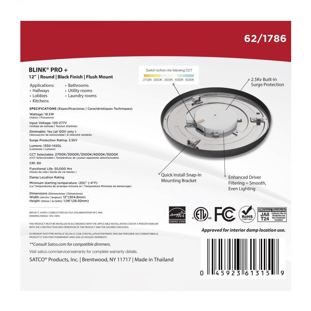 Blink Pro Plus; 19.5 Watt; 12 in.; Surface Mount LED; CCT Selectable; 90 CRI; Black Finish; 120/277
