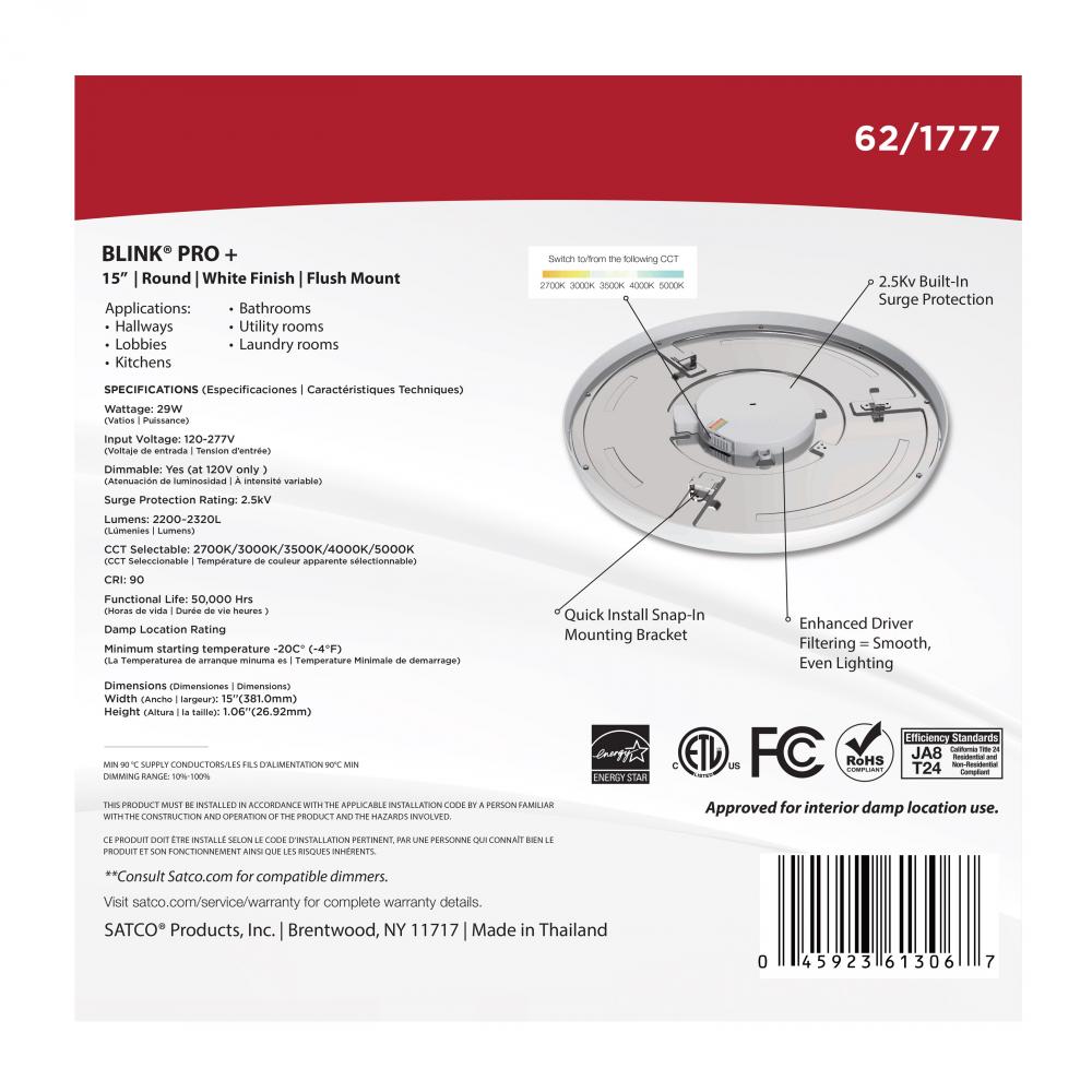 Blink Pro Plus; 29 Watt; 15 in.; Surface Mount LED; CCT Selectable; 90 CRI; White Finish; 120/277