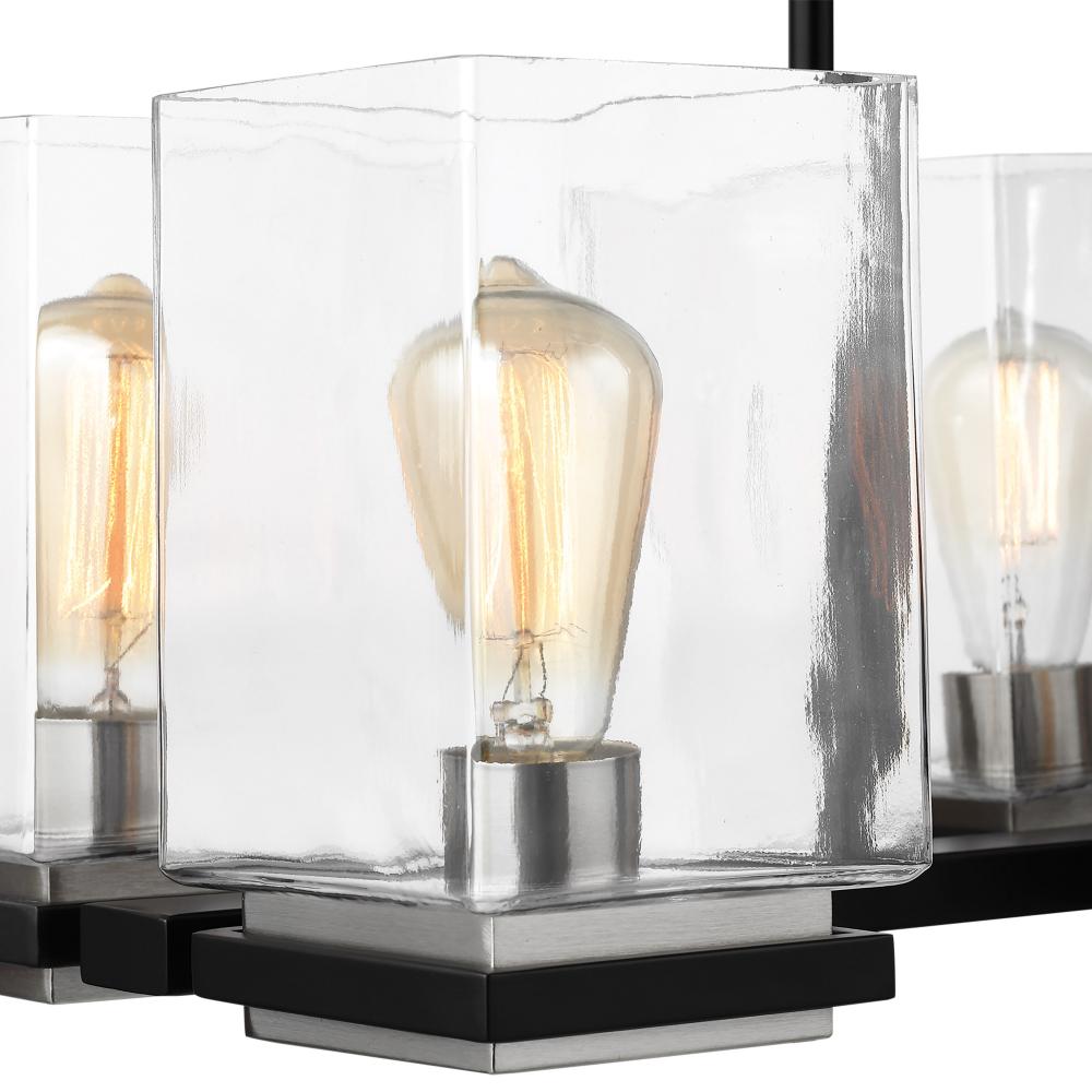 A combination of glass and metal comes together to create the stunning design of the Crossroad island light. The square, clear glass shades showcases the bulbs. The sockets and base are finished in brushed nickel to contrast beautifully with the matte blac