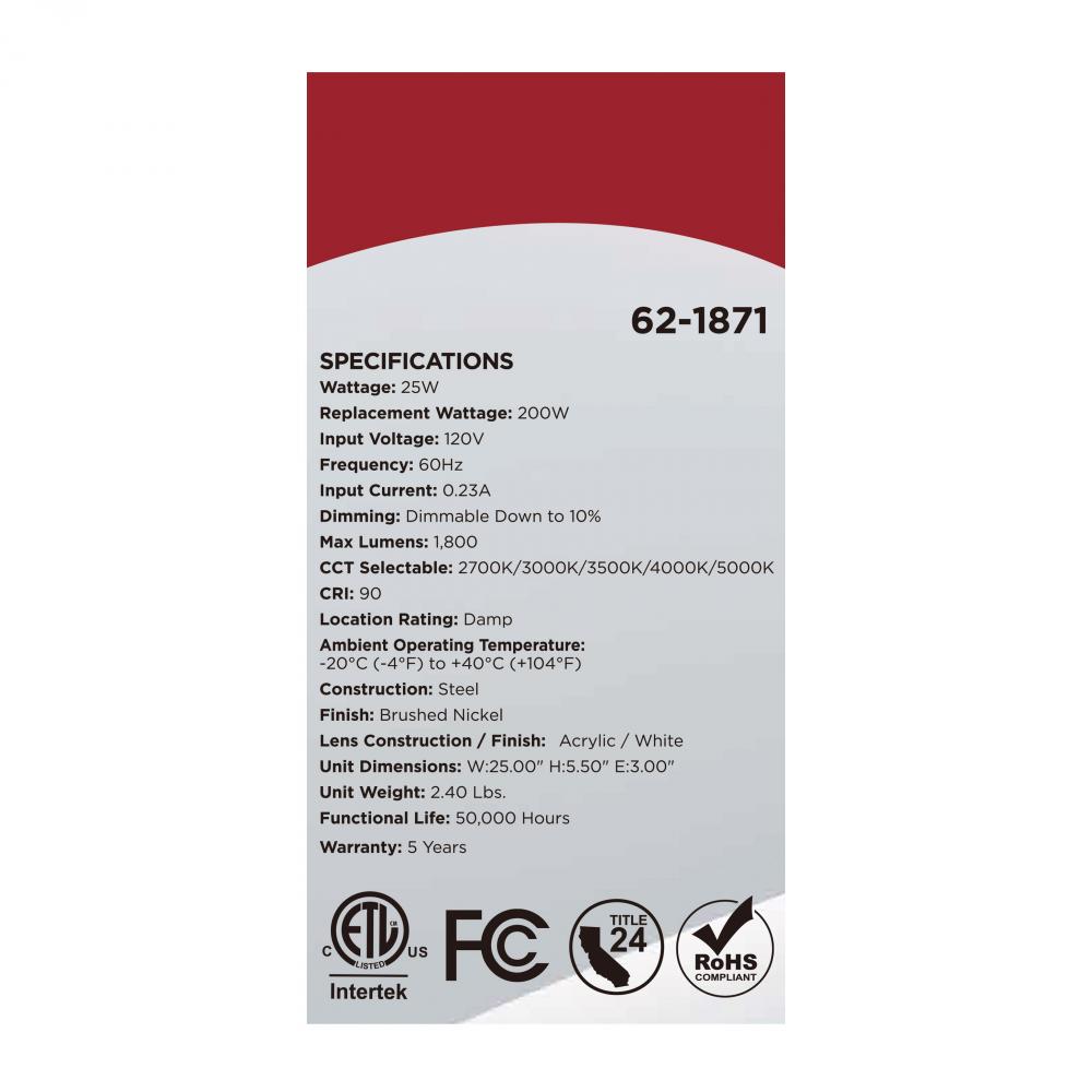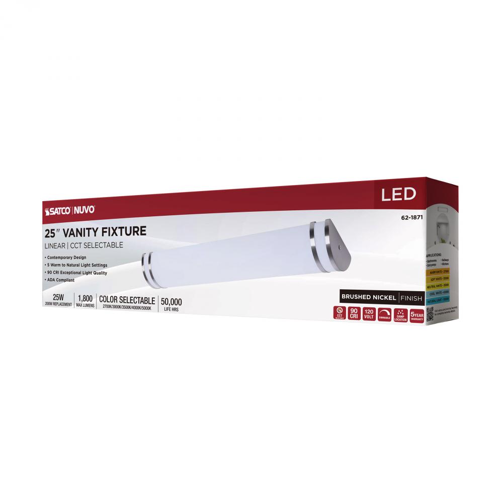 The SATCO NUVO 62-1871 Glamour 25-inch Vanity Fixture in Brushed Nickel offers sleek, modern lighting with 5 CCT selectable technology (2700K–5000K) and 90 CRI illumination for vibrant color rendering. This 25-watt fixture replaces 200W incandescent ligh