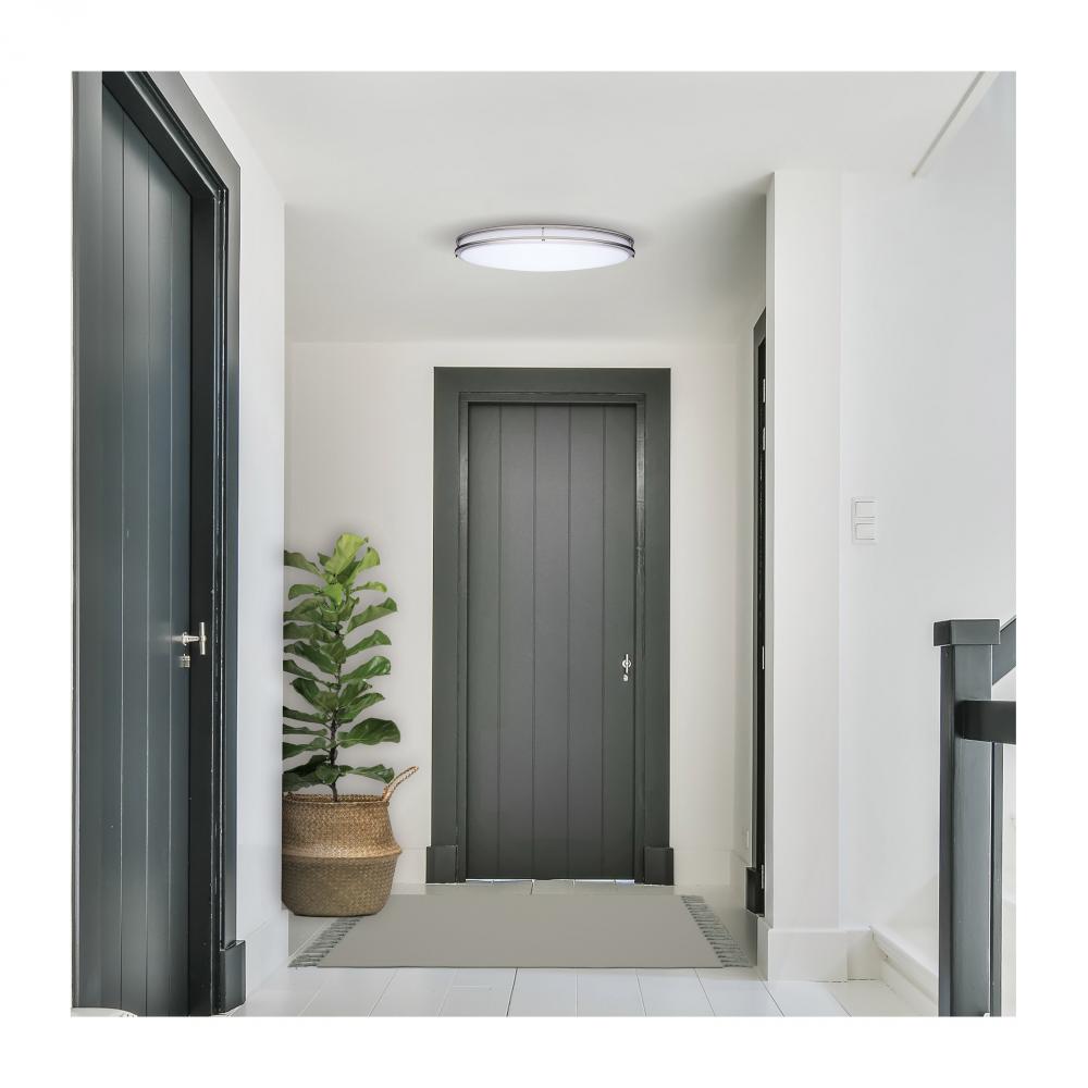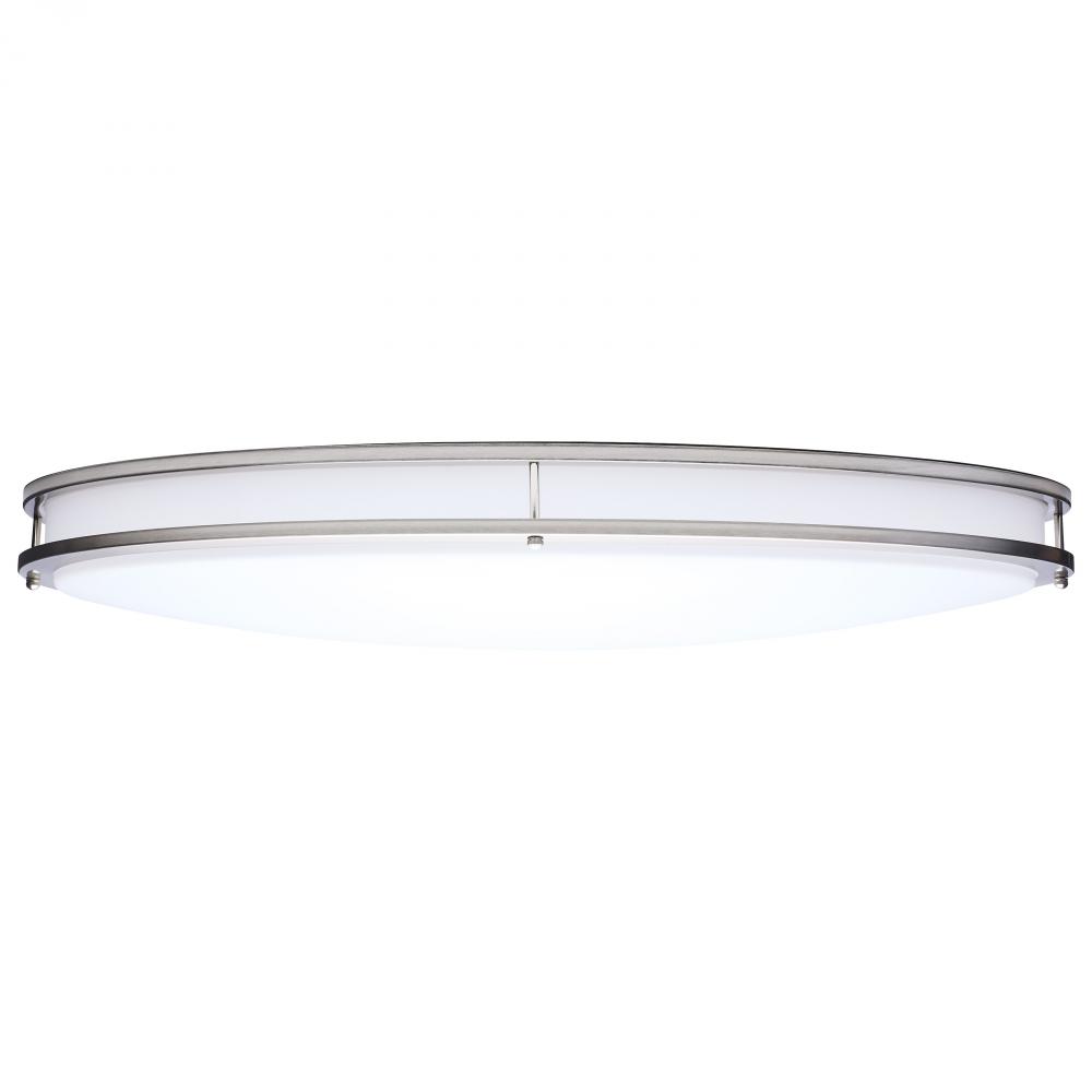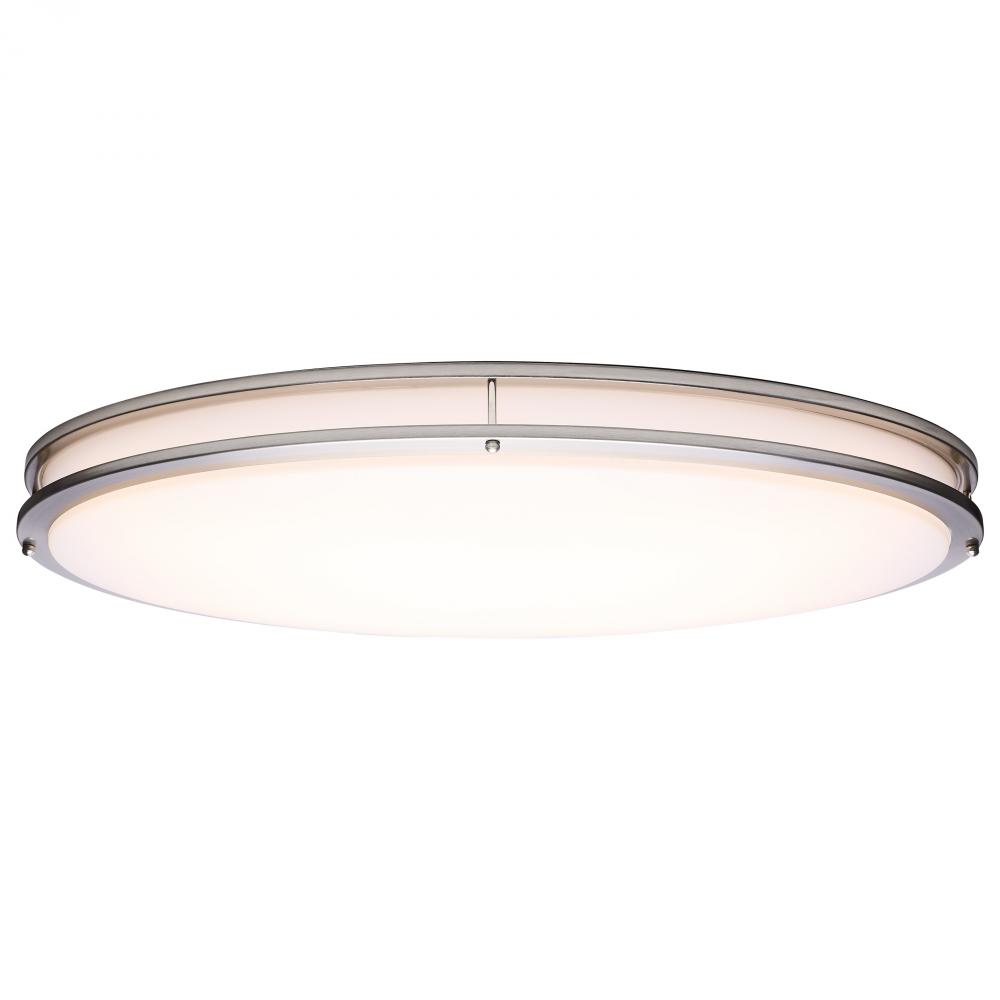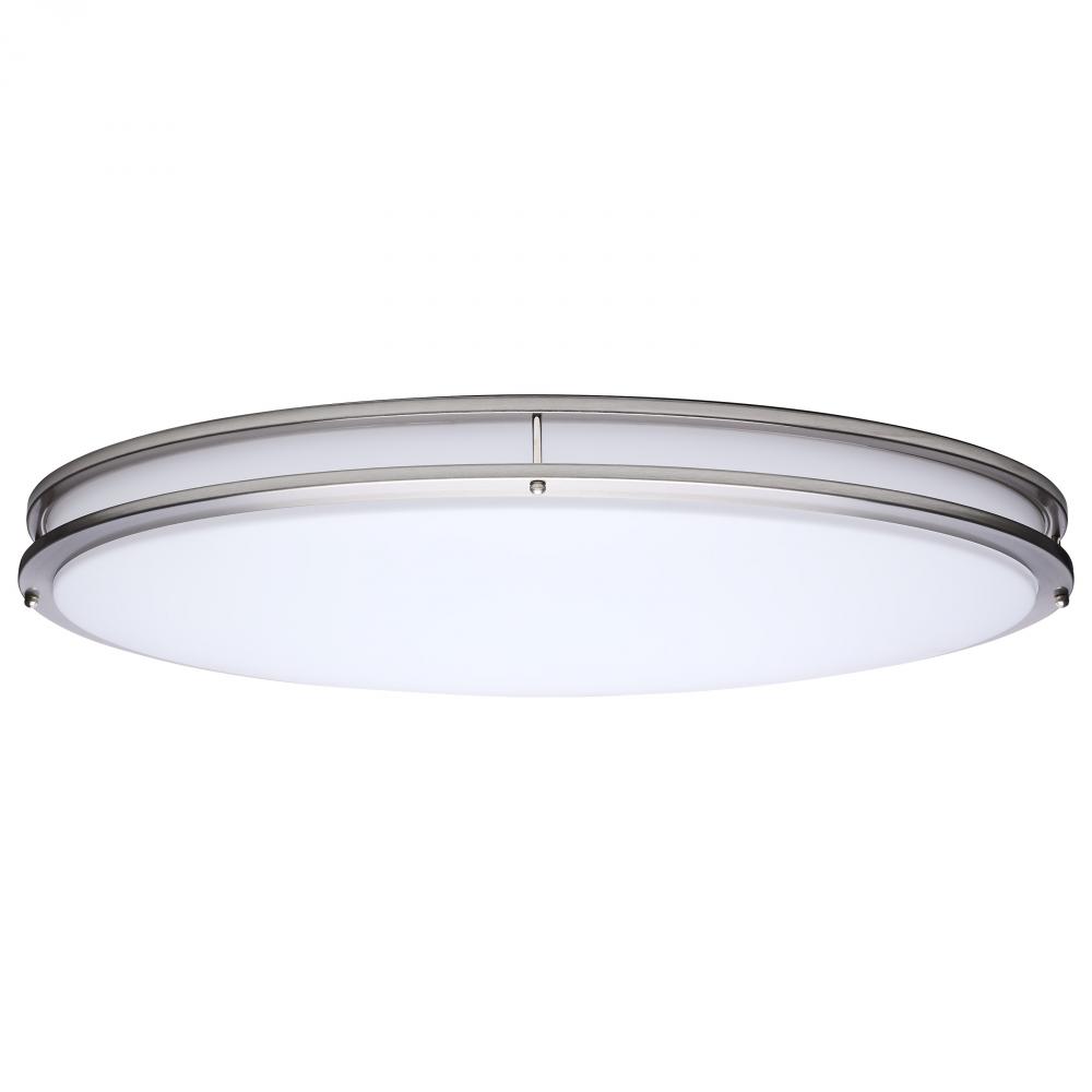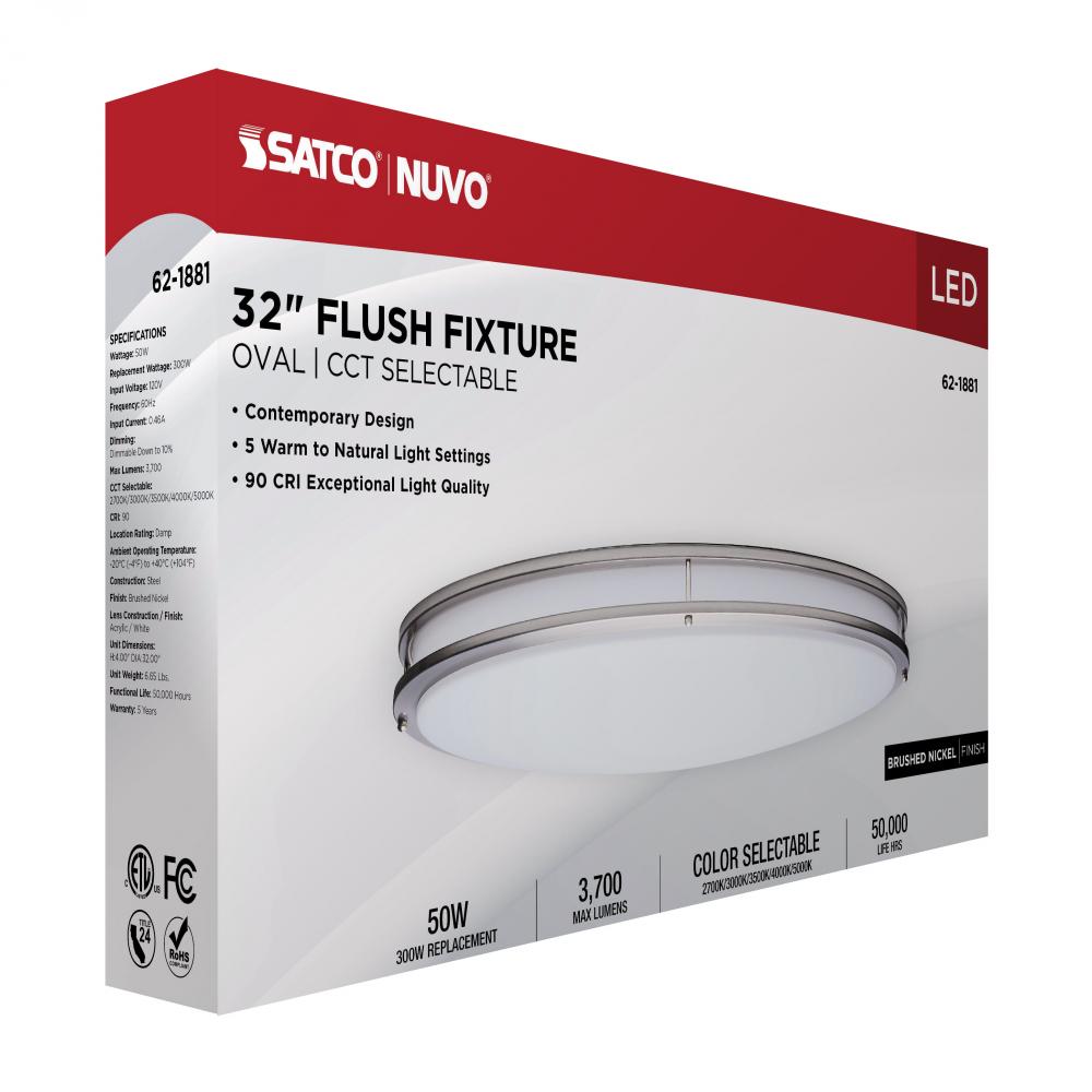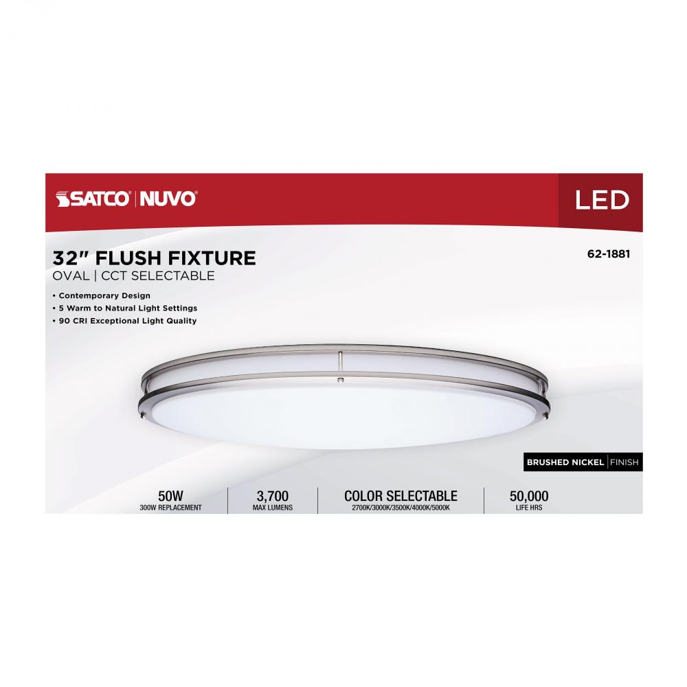 The SATCO NUVO 62-1881 Glamour 32-inch Oval Flush Mount in Brushed Nickel combines modern design with energy-efficient performance, featuring 5 CCT selectable technology (2700K–5000K) and 90 CRI illumination for superior color rendering. This 50-watt fix