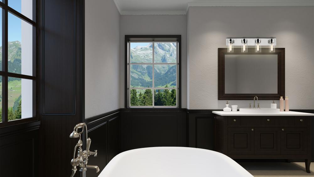 The blend of styles (modern, industrial and chic) is incorporated beautifully into the design of the Intersection 60-7634 four-light vanity fixture. The cylindrical clear glass shades showcase vintage filament bulbs for a touch of nostalgia. The sleek, mir