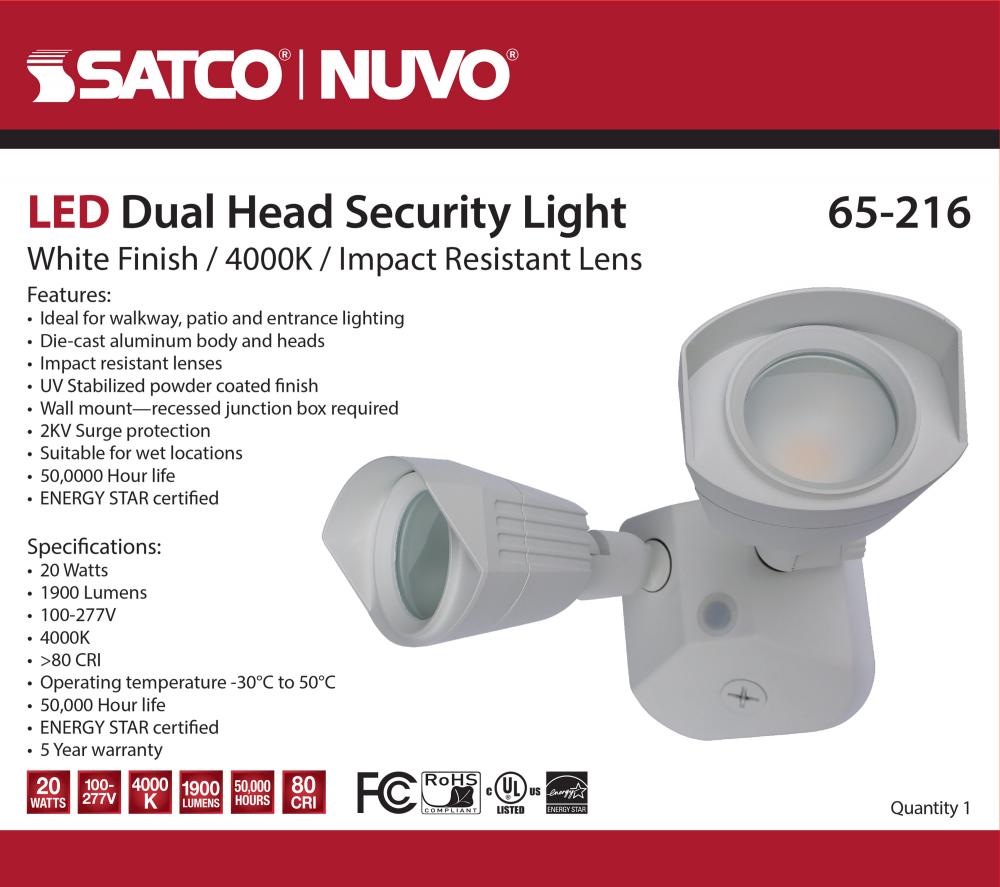 The NUVO 65-216 frosted 20-watt LED dual head security light offers cool white lighting in a white finish. Illuminate walkways, patios, and entrances with this die-cast aluminum security light. Durable and long-lasting, this fixture delivers 50,000 hours o