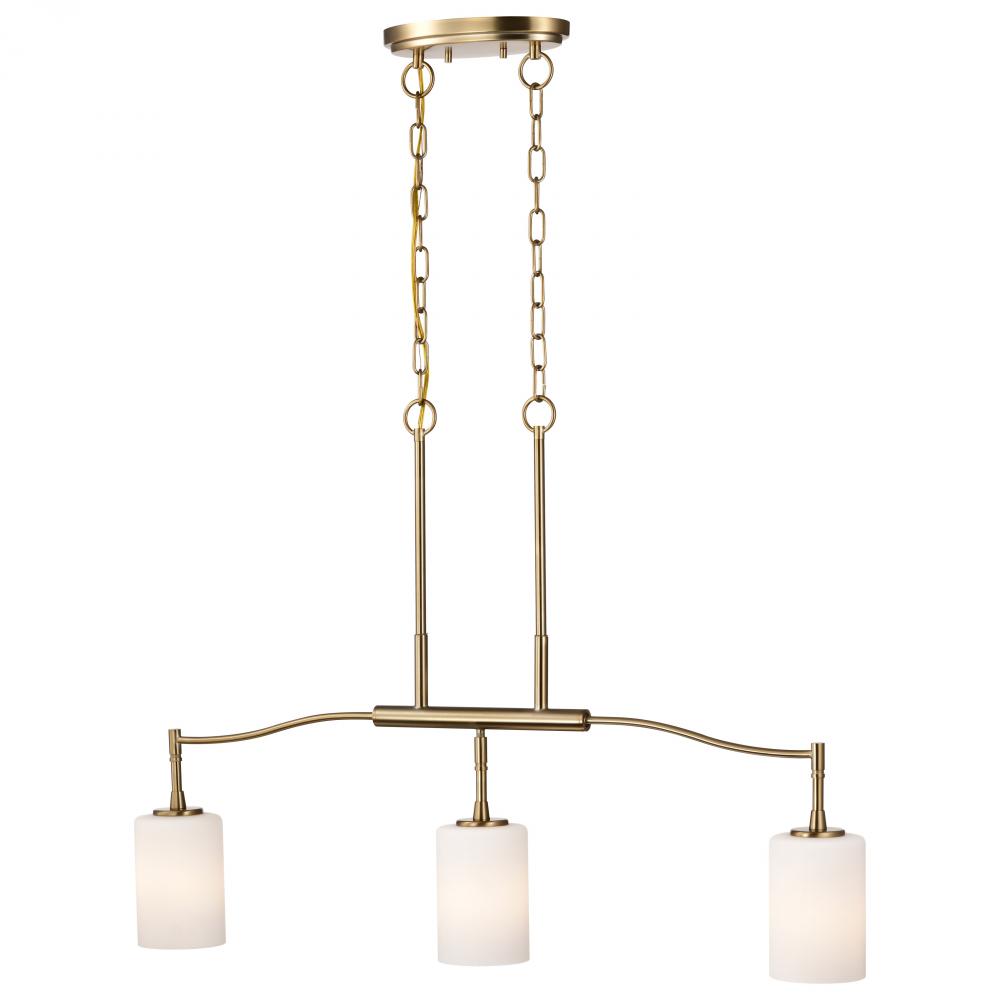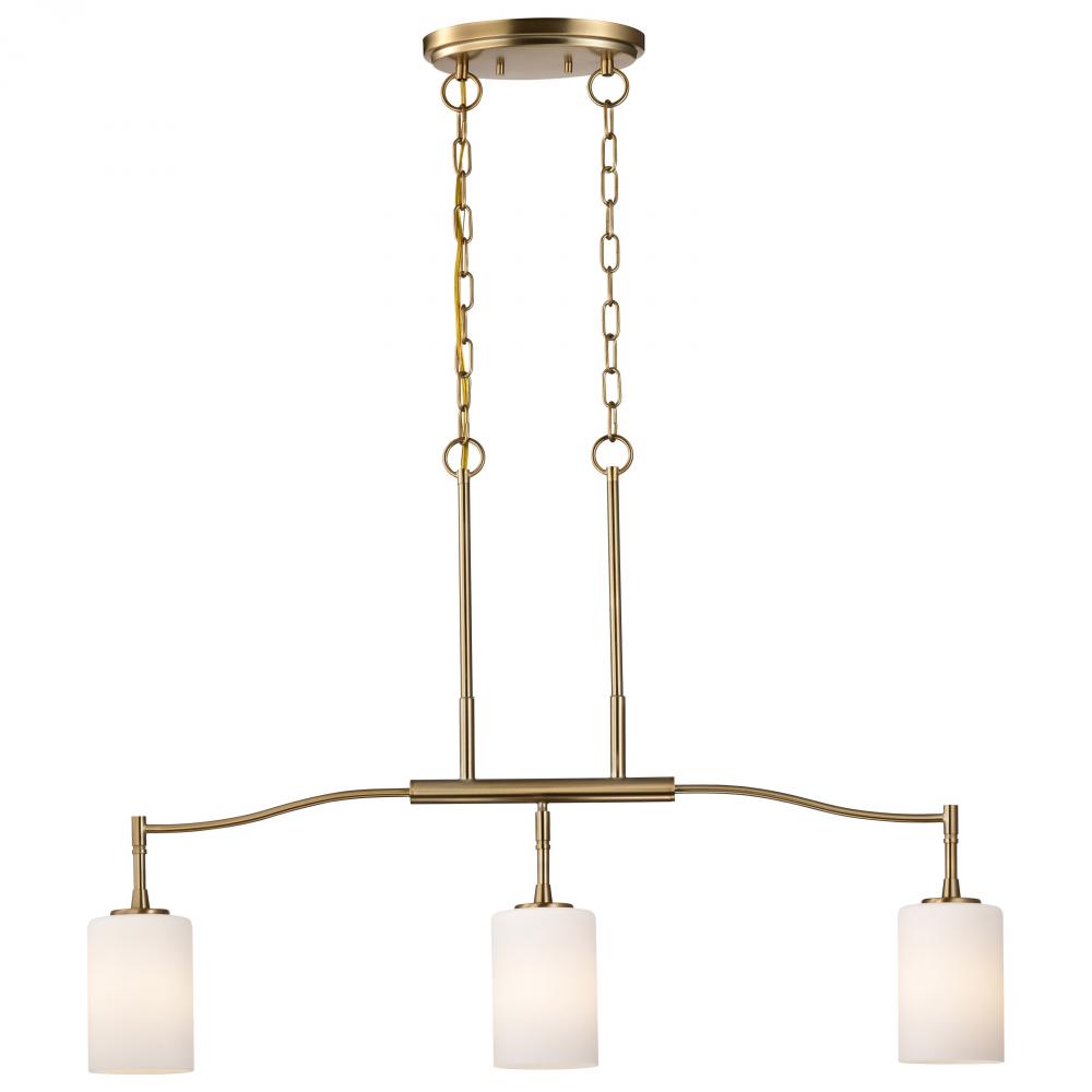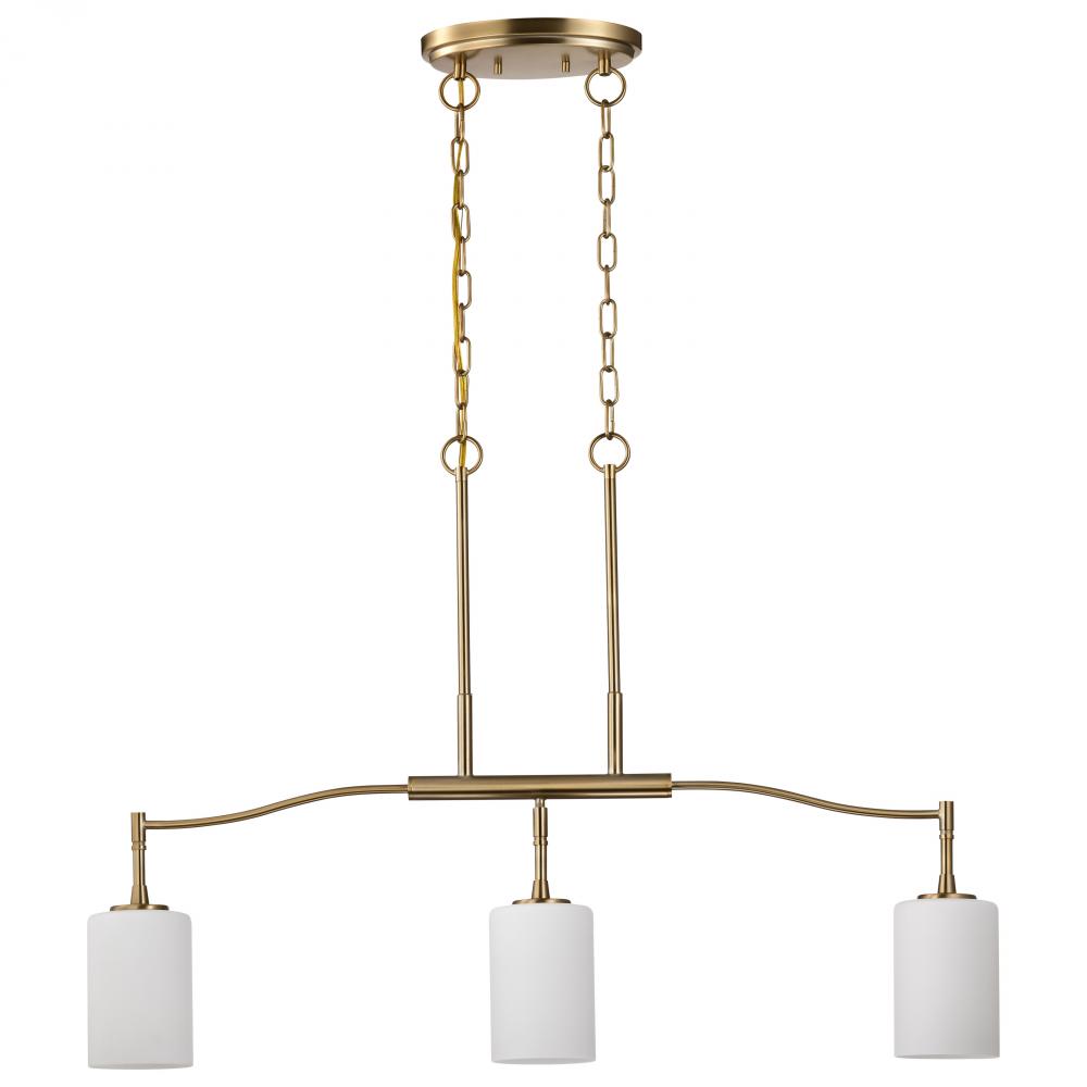 Seamlessly blending transitional design with contemporary accents, the Liam 60-8208 three light island fixture exudes understated elegance. A sophisticated burnished brass finish, perfectly complements the soft glow of white opal glass. With its broad appe