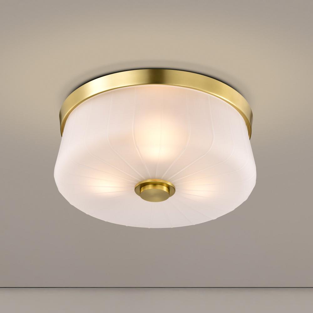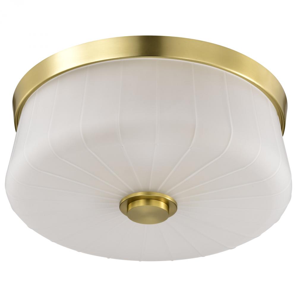 Lune; 3 Light Flush Mount; Vintage Brass Finish; Etched White Glass