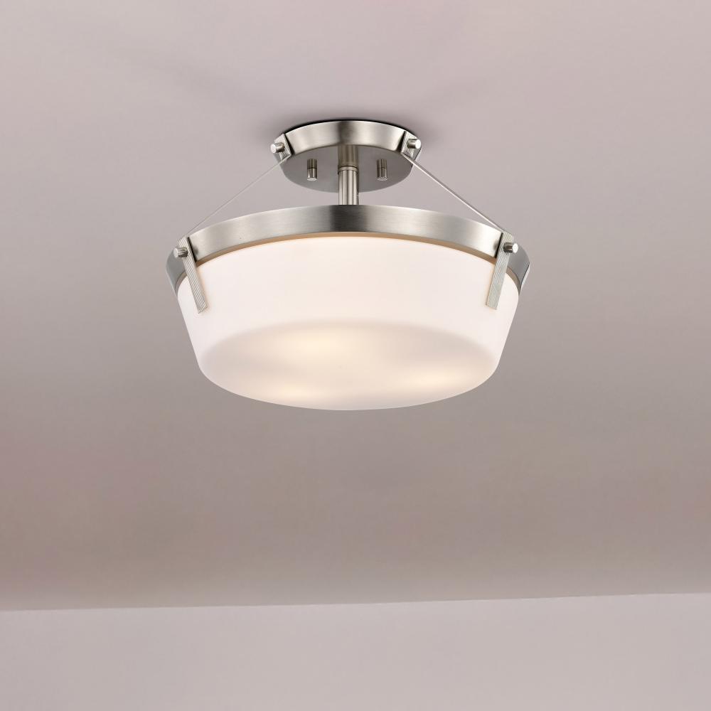 The Rowen 60-7763 semi-flush mount is a versatile lighting fixture that exudes elegance and sophistication. The brushed nickel finish gives the fixture a chic and inviting look, while the etched white glass diffuses the light to create a soft and ambient g