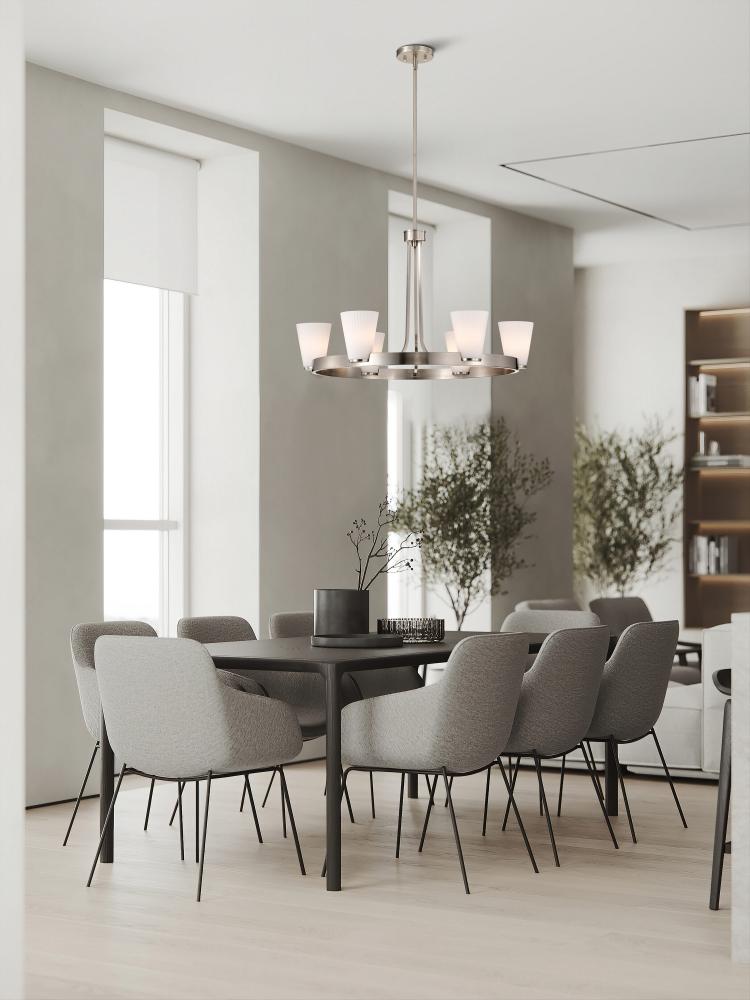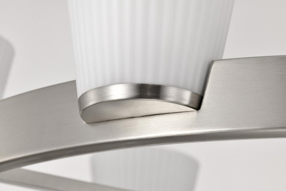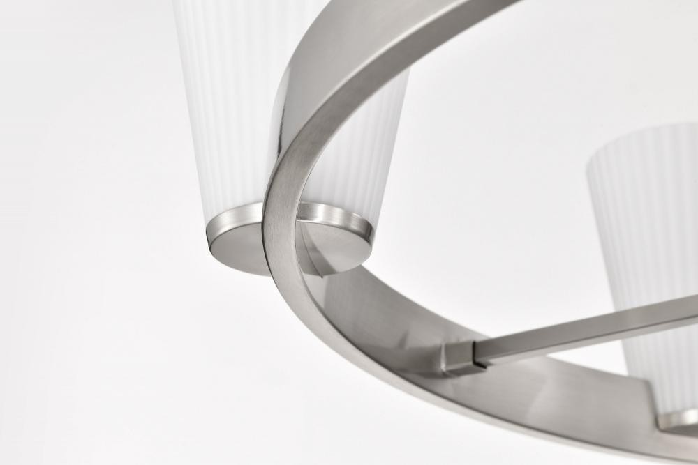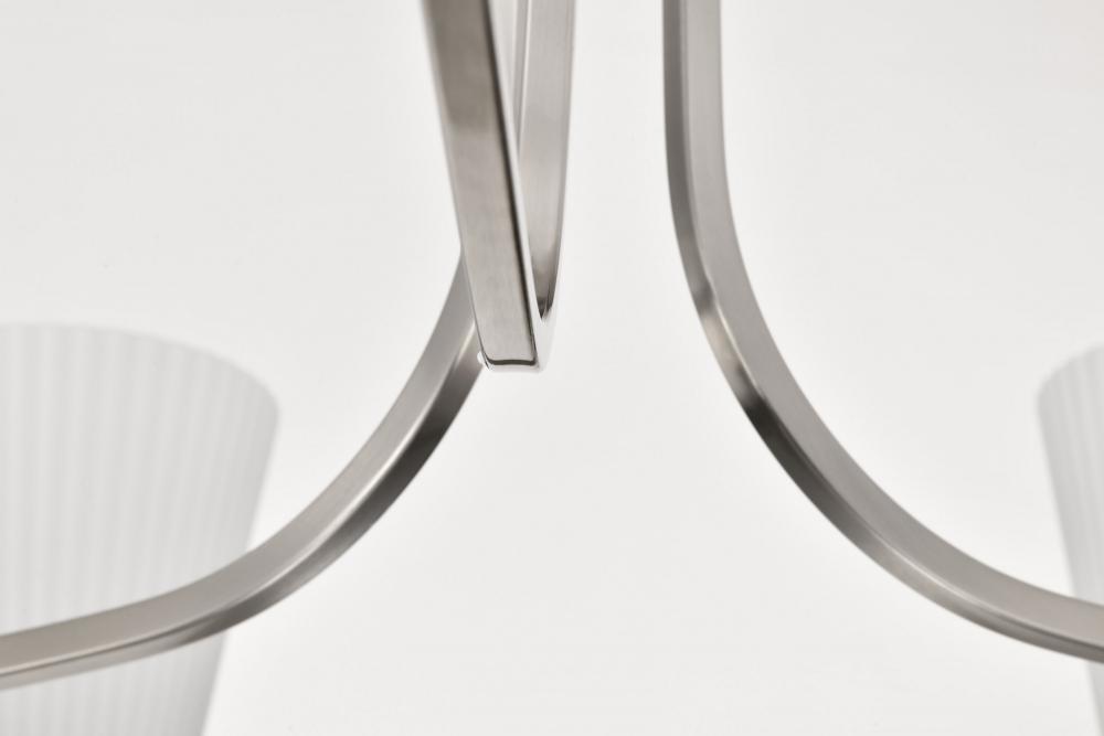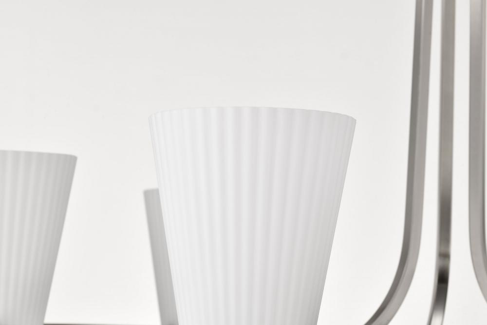 Indulge in the glamour of the Royale 60-8736 five light chandelier, where sleek Art Deco silhouettes meet modern refinement. The satin white pleated glass adds texture and sophistication, diffusing light with a soft, radiant glow. Finished in brushed nicke