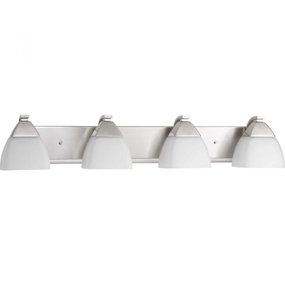 Four-light bath with distinctive forms that highlight soft modern accents. Etched white glass shades balance nicely with the fixture's full back plate and simple square arms, contributing to a desired spa-like effect. Brushed Nickel finish.