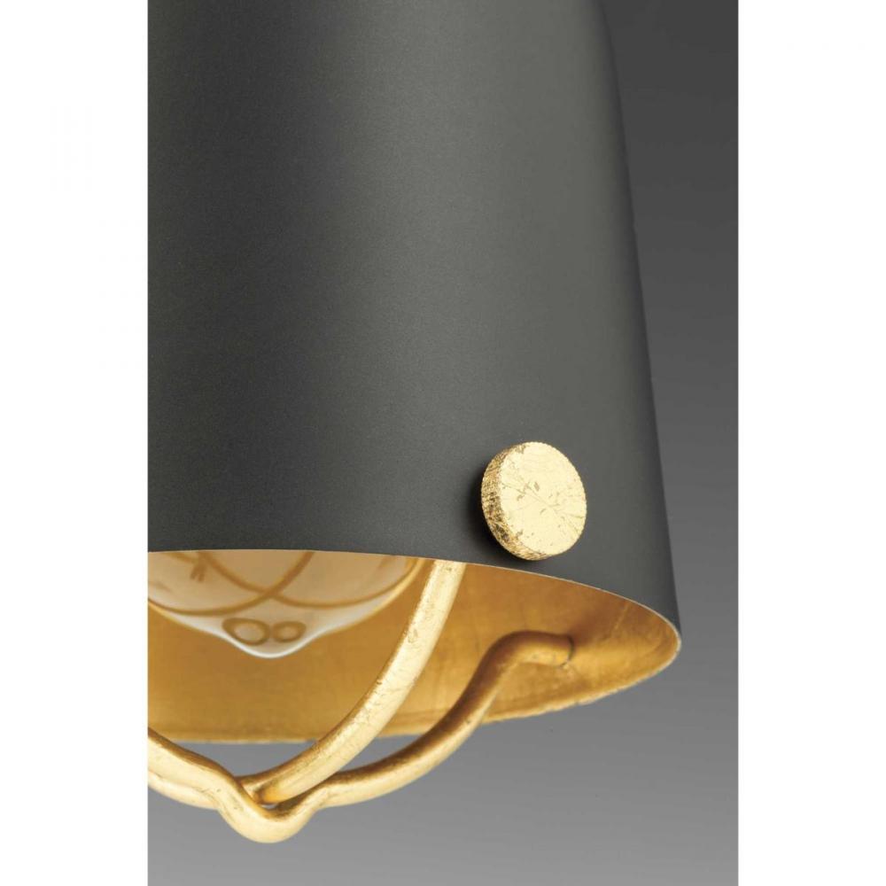 With Era's carefully crafted details and special eclectic accents achieve a vintage electric feel. One-light mini-pendant is in a Black finish with gold leaf accents and a cloth covered cord.