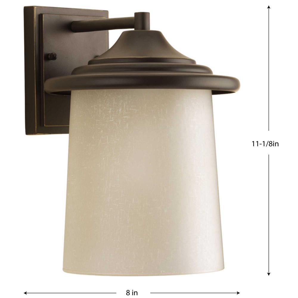 Outdoor one-light medium wall lantern with an etched umber linen glass shade in an Antique Bronze finish.