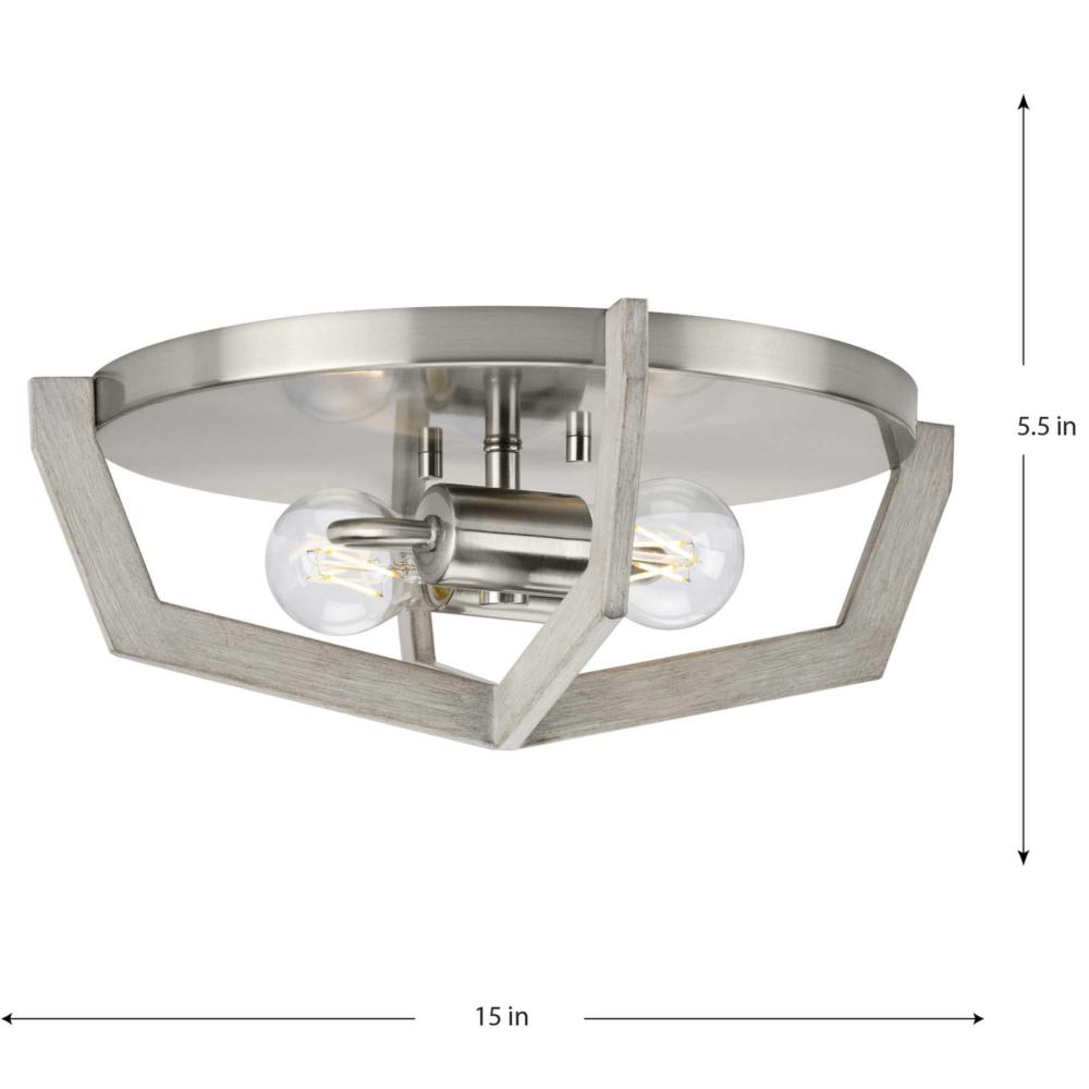 Clean, modern lines combine with rustic elements in the Galloway Collection Flush Mount Light. A lightly distressed finish of grey washed oak highlights an open, angular frame suspended from an impressive circular canopy finished in brushed nickel. Brushed nickel columns hold lights that glow brightly within the stately form to illuminate spaces in a casually elegant style. The close-to-ceiling design provides clear, bright illumination to bedrooms, hallways and foyers. Use vintage-style decorative bulbs (sold separately) to enhance the rustic effect.