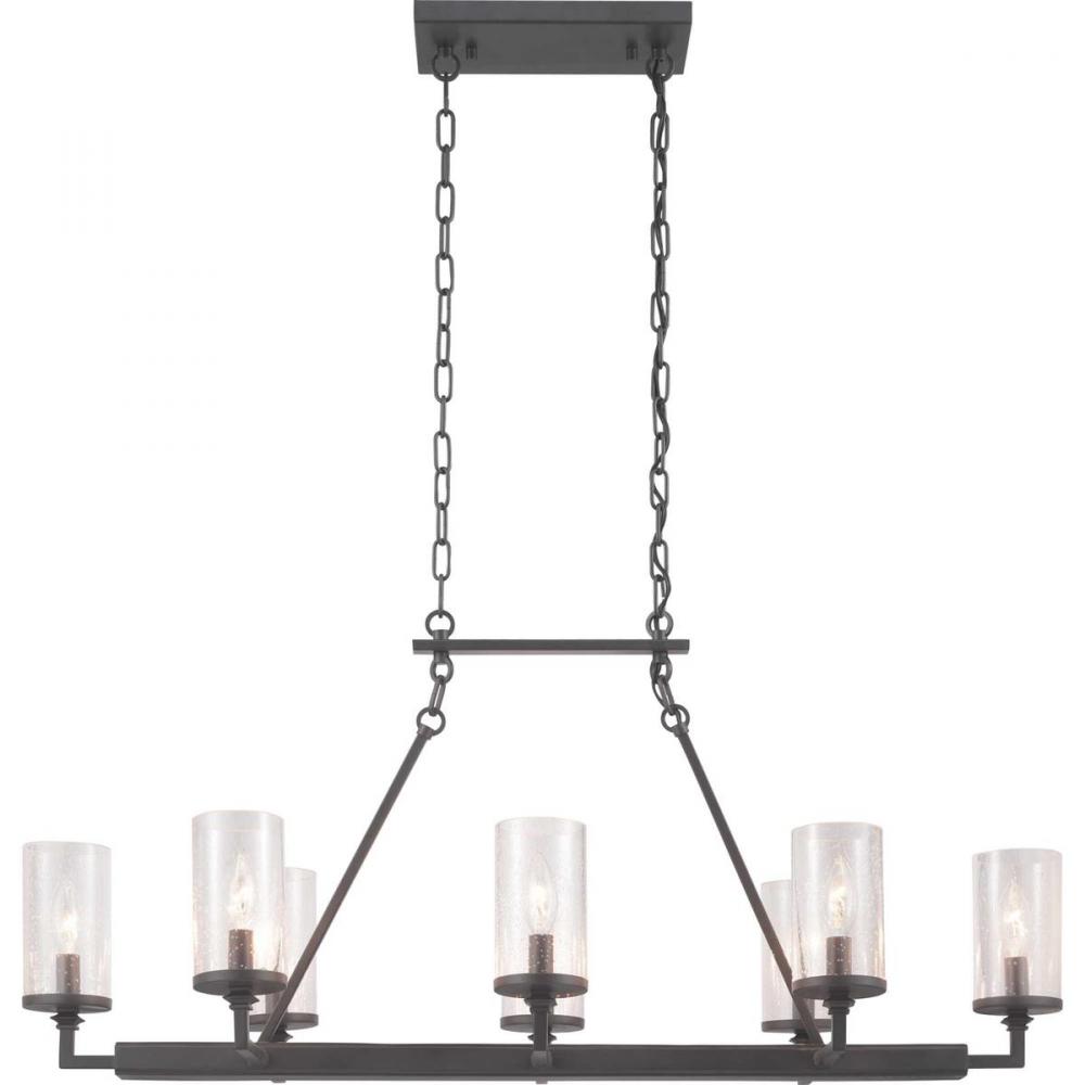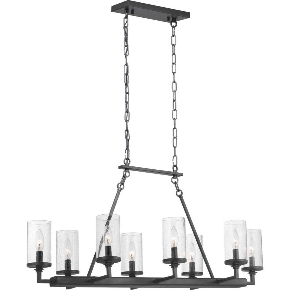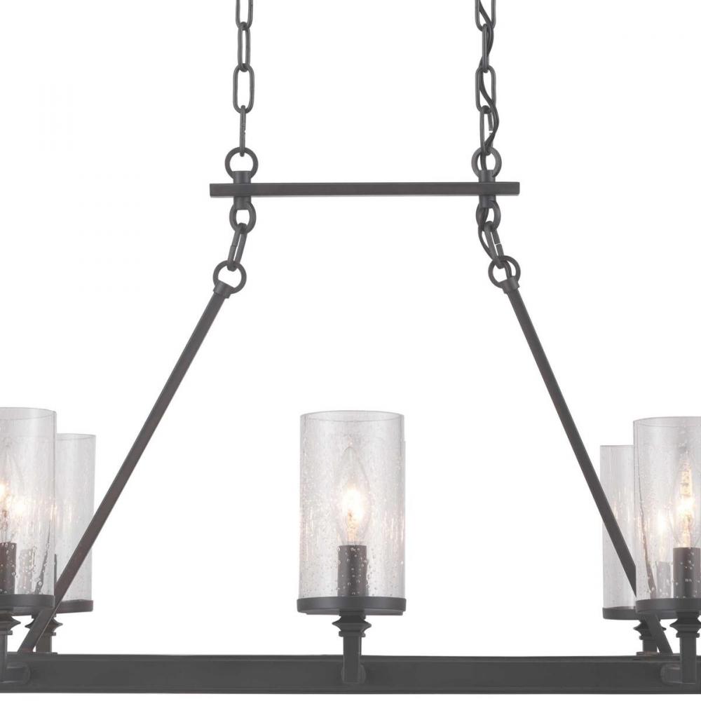 Graphite finishes and organic seeded-glass shades form the basis of this collection that channels traditional iron structures;This eight-light linear chandelier is perfect over a long farmhouse dining table or library table;The fixture feels most at home i