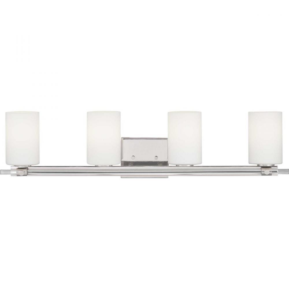 Enjoy high status with a four-light bath and vanity in the Lisbon Collection that is full of femininity, gleam and shine. Etched opal glass shades sit atop an elegant K9 glass rod, highlighted with a Polished Nickel finish. The highly polished design style complements both Modern and Luxe interiors – and can be mounted up or down.