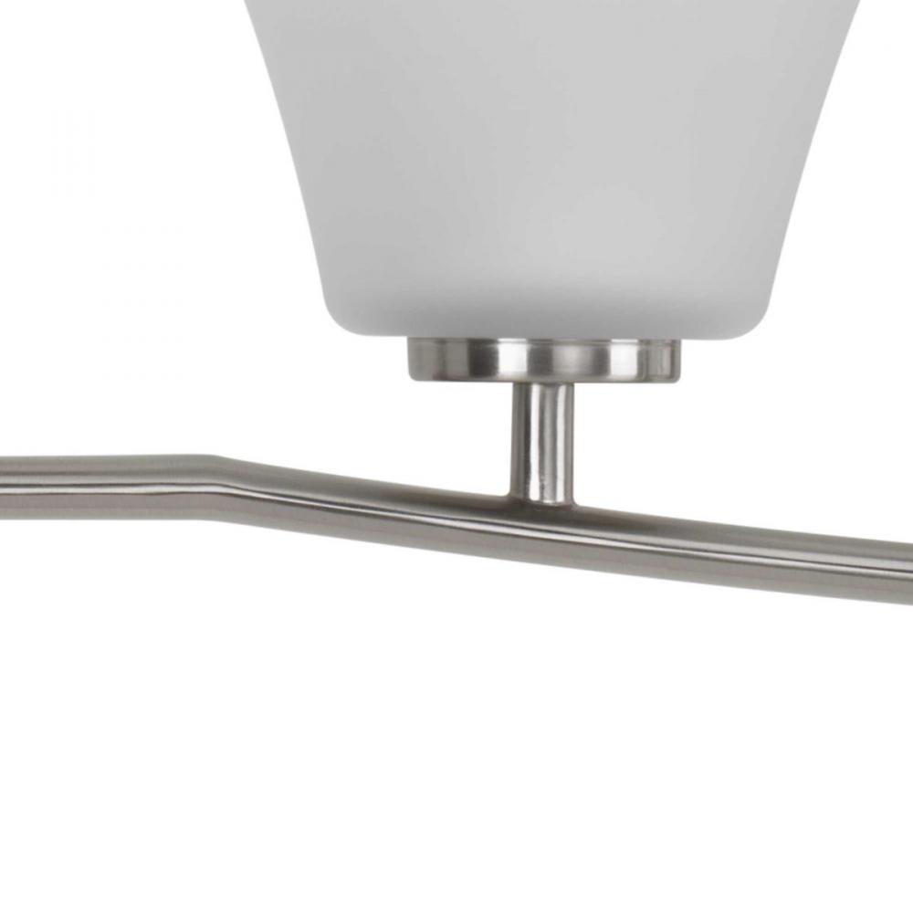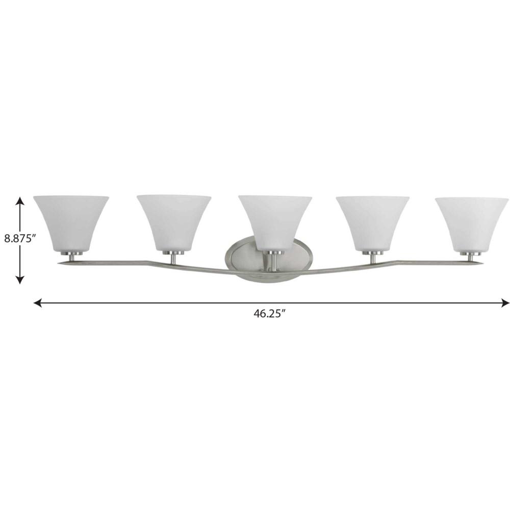 Five-light bath finished in Brushed Nickel with etched glass shades scaled across a slightly arching, pointed arm. Generously balanced glass shades add distinction and provide pleasing illumination to your room. Coordinating fixtures from this collection let you decorate an entire home with confidence and style.