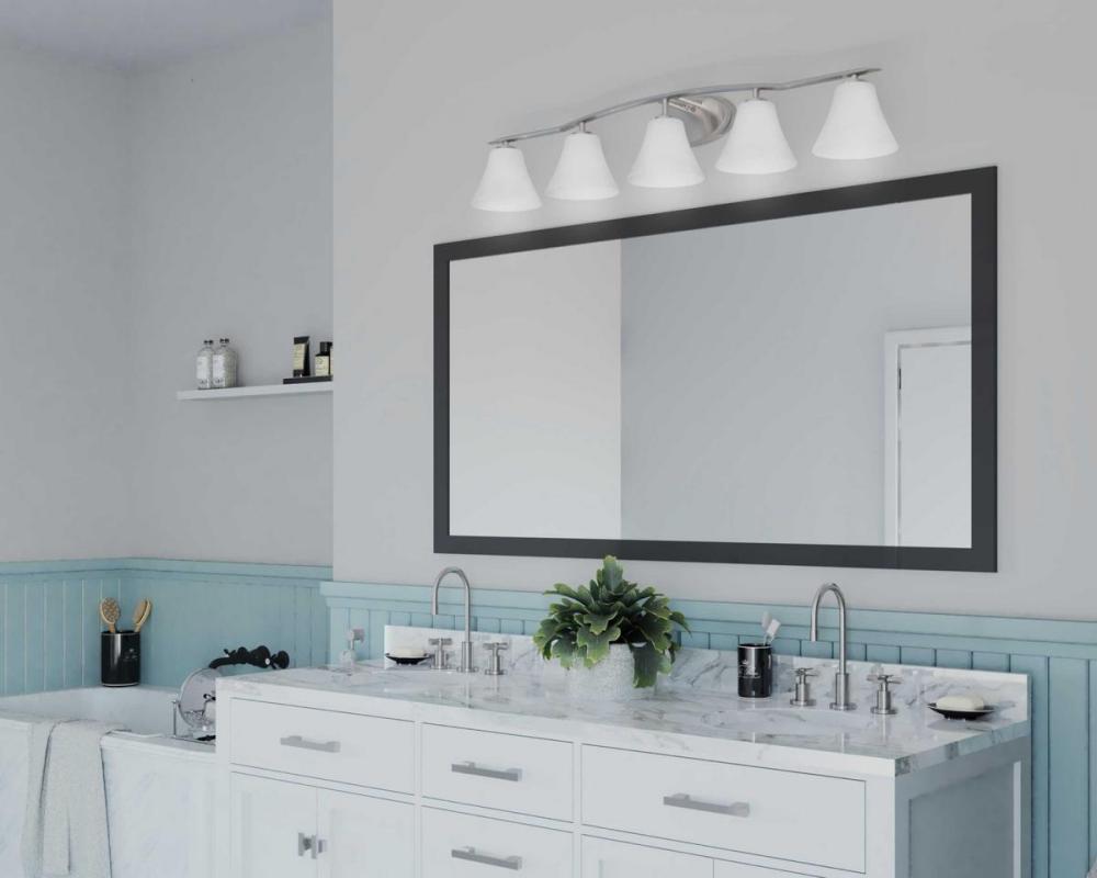 Ideal for a bathroom;Perfect for modern and transitional style settings;Beautiful brushed nickel finish;Elegant etched glass shades;Mount the light fixture facing up or down;Use 5 medium base bulbs that are sold separately (100 W max - LED/CFL/incandescent