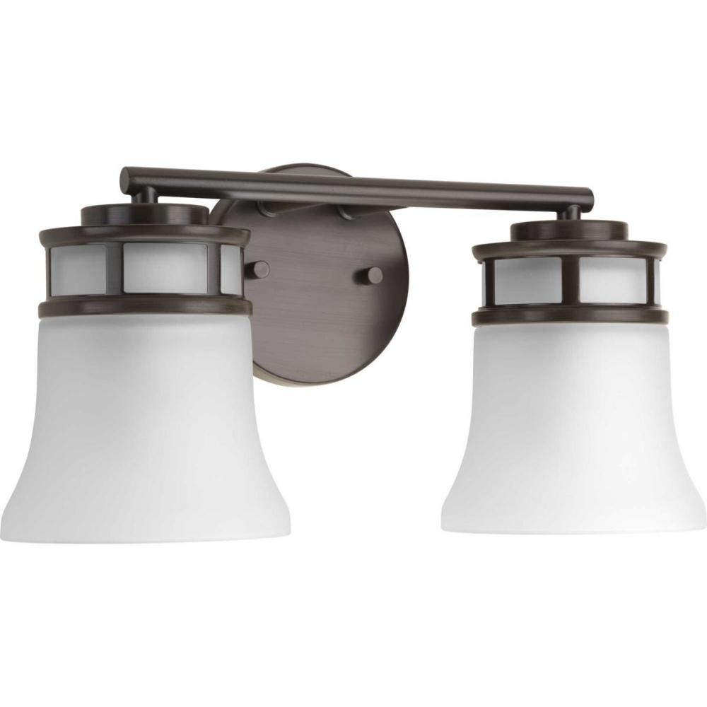 Two-light bath & vanity with smooth forms and windowpane style gallery that produce a beautiful, modern gas light effect. Overscaled tubing and etched glass shades offer substance within the sleek frame. Can be mounted up or down. Antique Bronze finish.