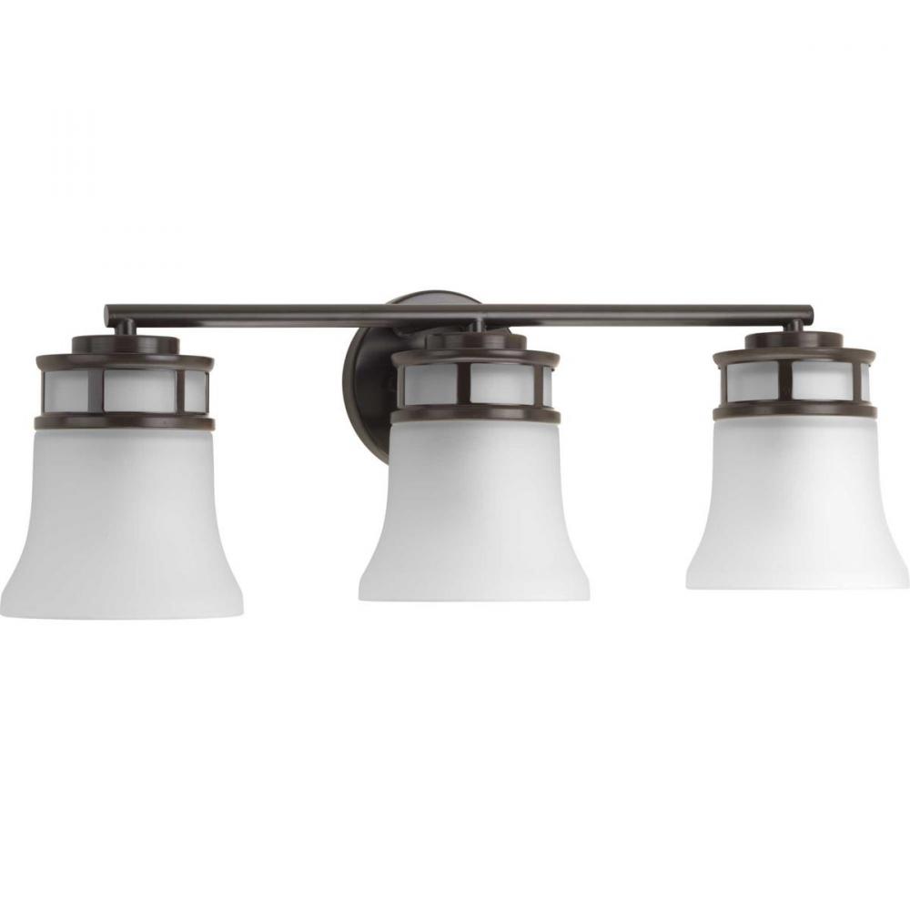 Three-light bath & vanity with smooth forms and windowpane style gallery that produce a beautiful, modern gas light effect. Overscaled tubing and etched glass shades offer substance within the sleek frame. Can be mounted up or down. Antique Bronze finish.