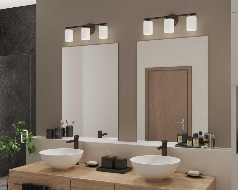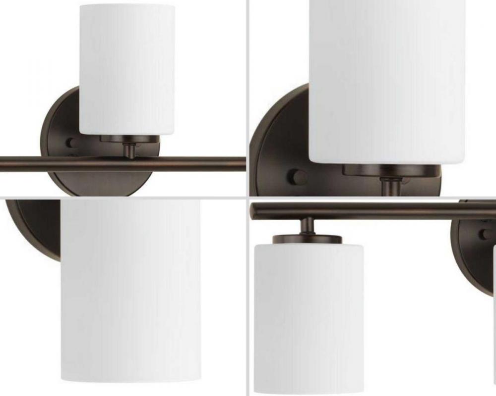 Ideal for a bathroom;Perfect for modern and transitional style settings;Handsome antique bronze finish;Elegant etched painted white glass shades;Mount the light fixture facing up or down;Use 3 medium base bulbs that are sold separately (100 W max - LED/CFL