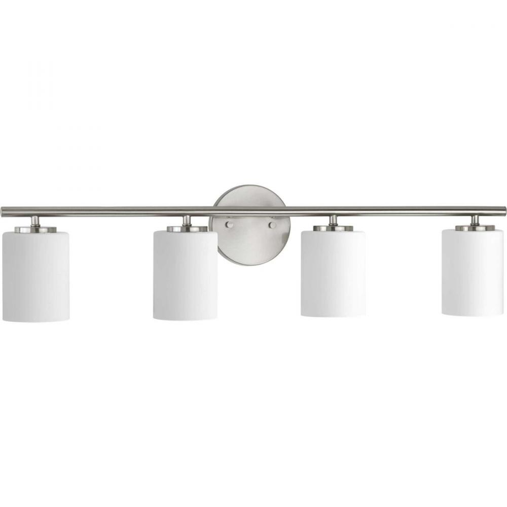 Four-light bath & vanity from the Replay Collection, smooth forms, linear details and a pleasingly elegant frame enhance a simplified modern look. Fixture can be mounted up or down. Brushed Nickel finish.
