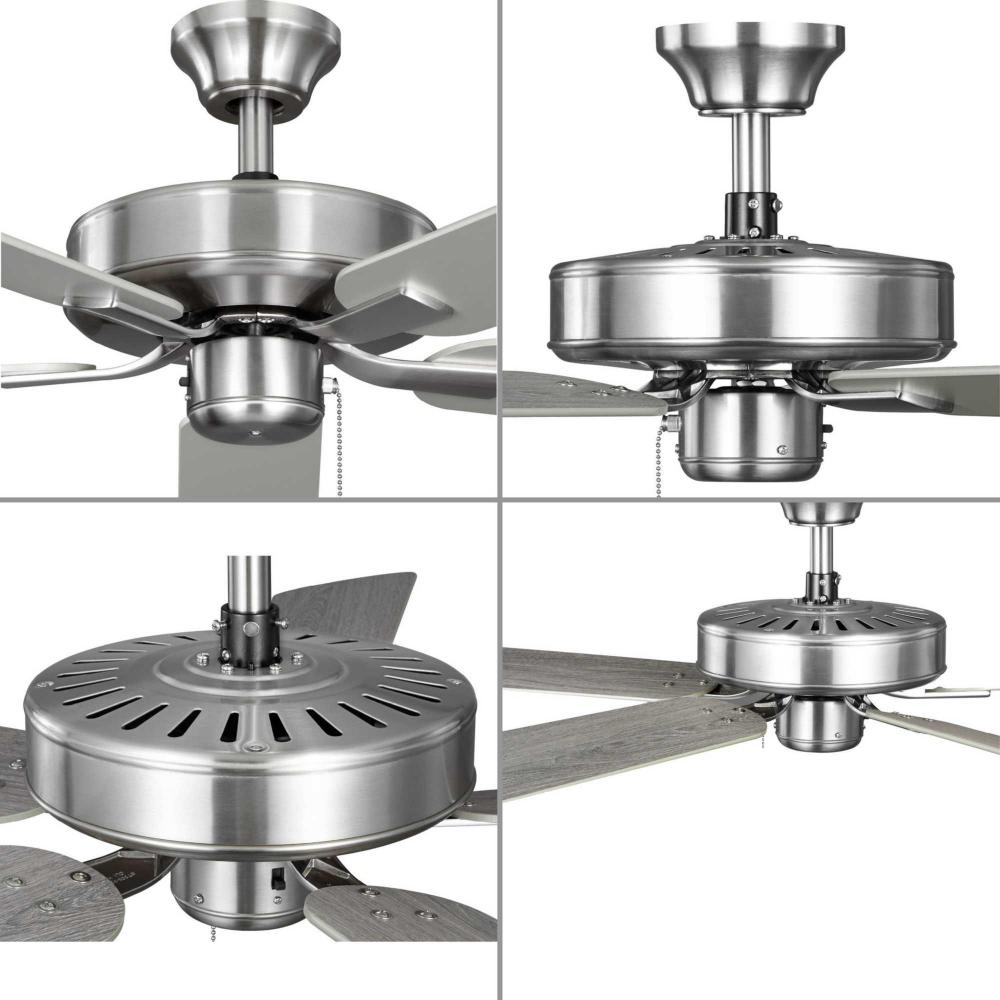 The AirPro 52” 5-blade ceiling fan refreshes interiors with a sleek, modern form coated in smooth Brushed Nickel finish. Five clean-lined fan blades extend outward from a streamlined motor housing that contains a powerful AC motor. Its versatile yet timeless design makes it ideal for a wide range of interior décor styles. The fan has an AC motor and is rated for maximum efficiency. The fan accepts a universal light kit and an accessory wall and remote control (all sold separately). The fan can be installed on a flat or sloped ceiling. The blade arms have Captive Screws allowing for easier installation.
