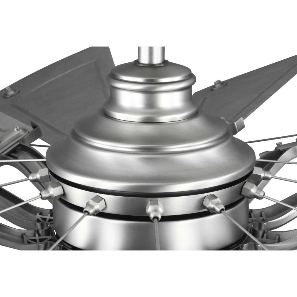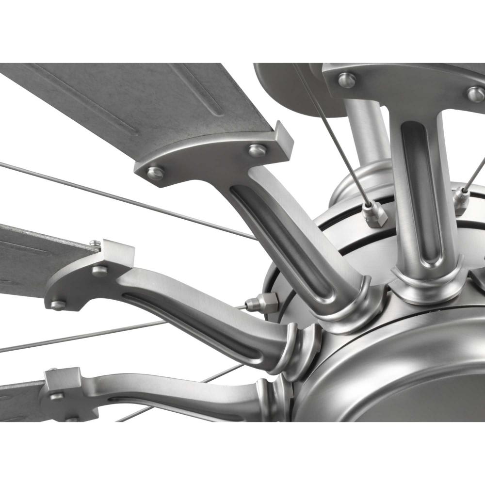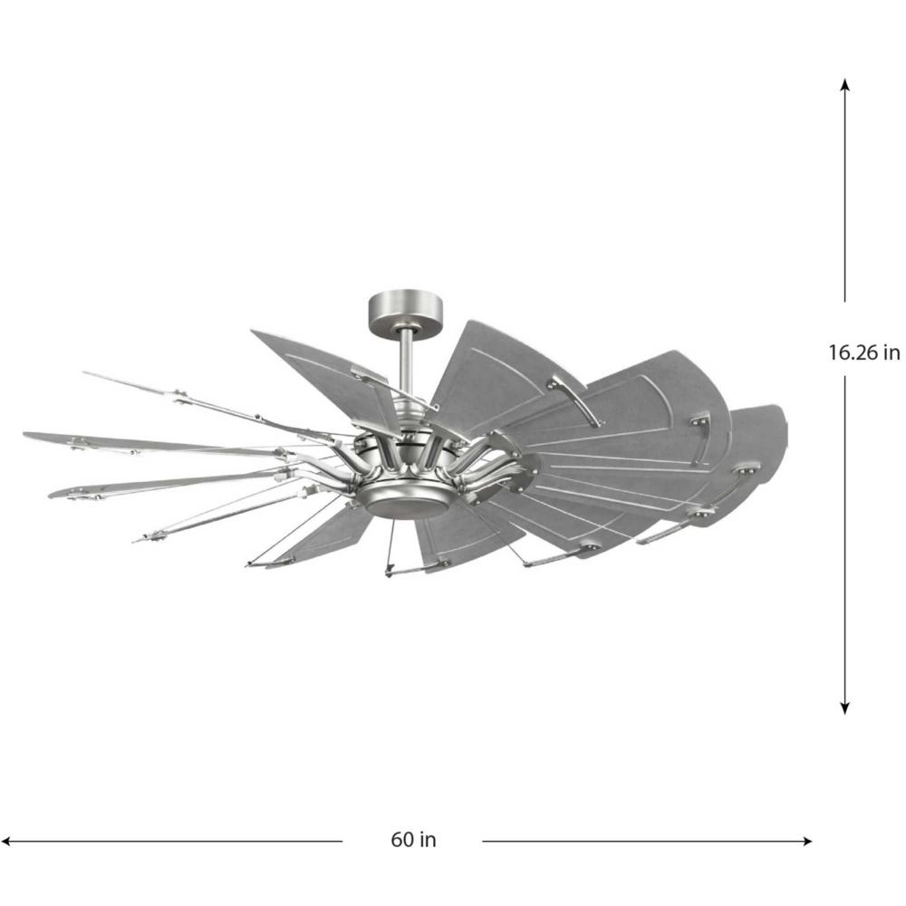 Relax under the refreshing breeze of the Springer Collection 60-Inch Windmill Ceiling Fan. Its large scale and windmill-style blades make it ideal for any great room, bedroom, living room, or bonus room in modern farmhouse, rustic, and coastal-style settings. The antique nickel body is complemented with twelve sweeping blades coated in a Galvanized affect for a rustic flair. Its cULus damp rating makes this lovely fan ideal for use inside or in outdoor covered areas. A 6 speed full-function remote control and wall bracket are included. .
