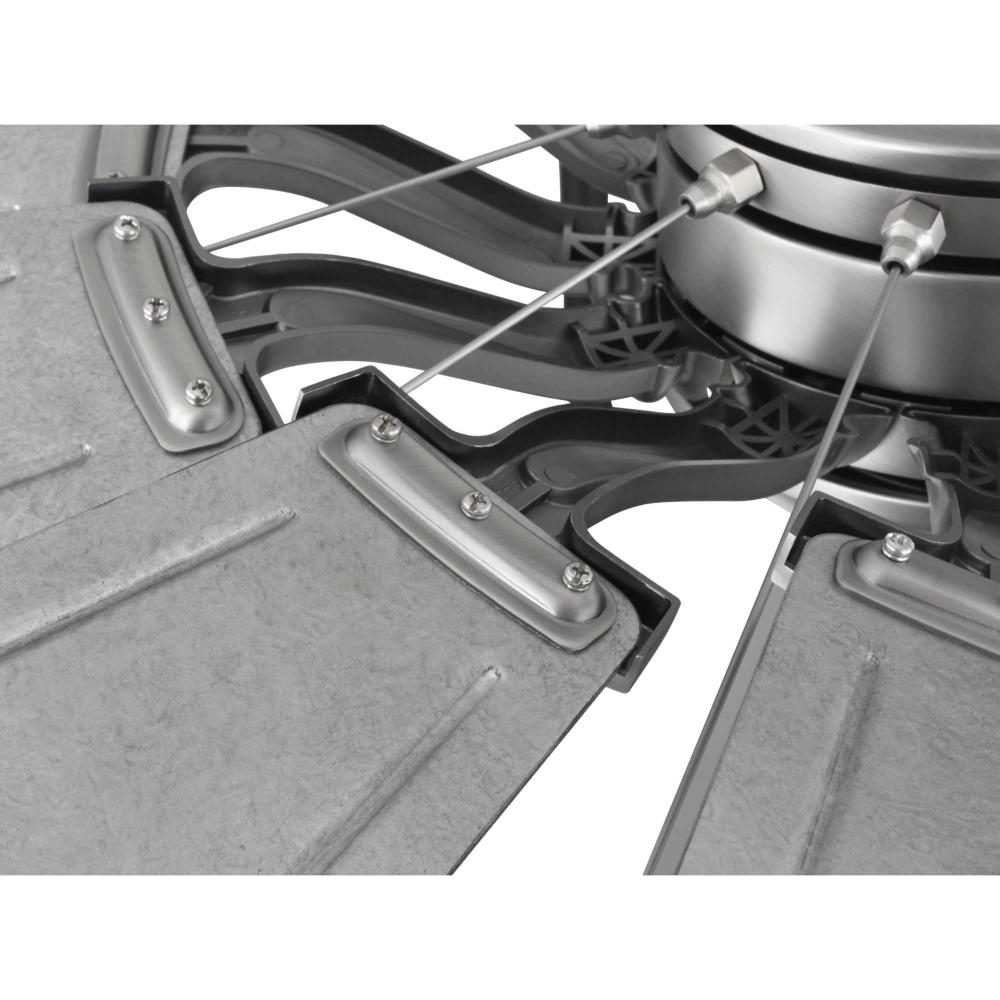 The fan is finished in antique nickel, showcasing the fixture's expansive modern design with twelve galvanized finish aluminum blades