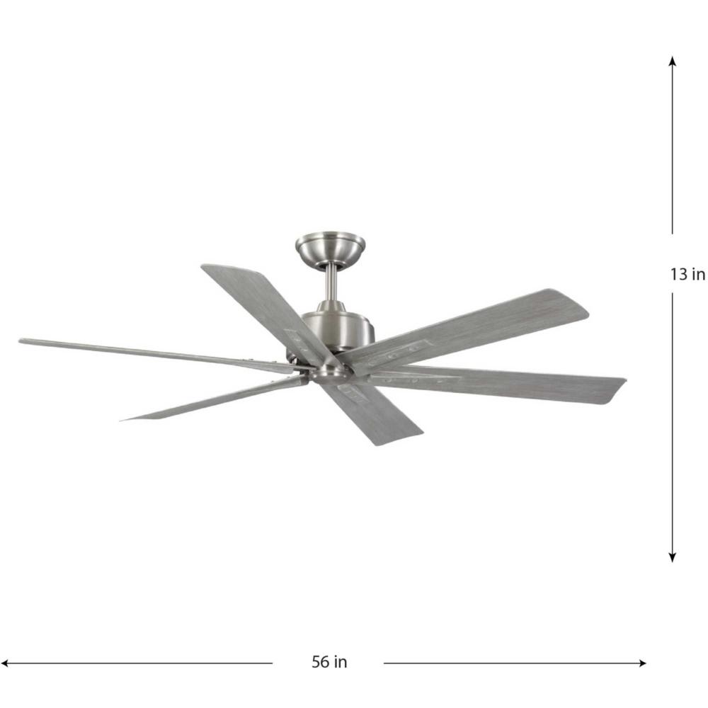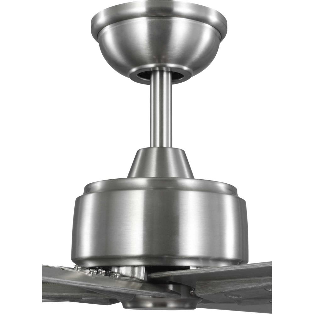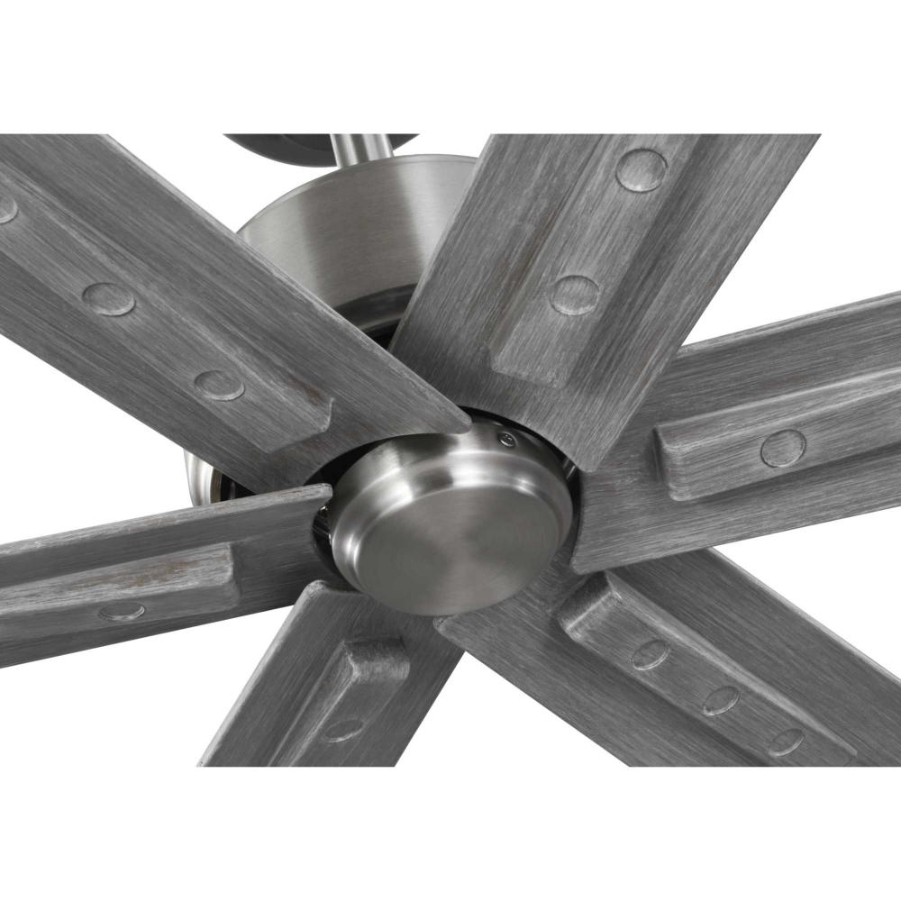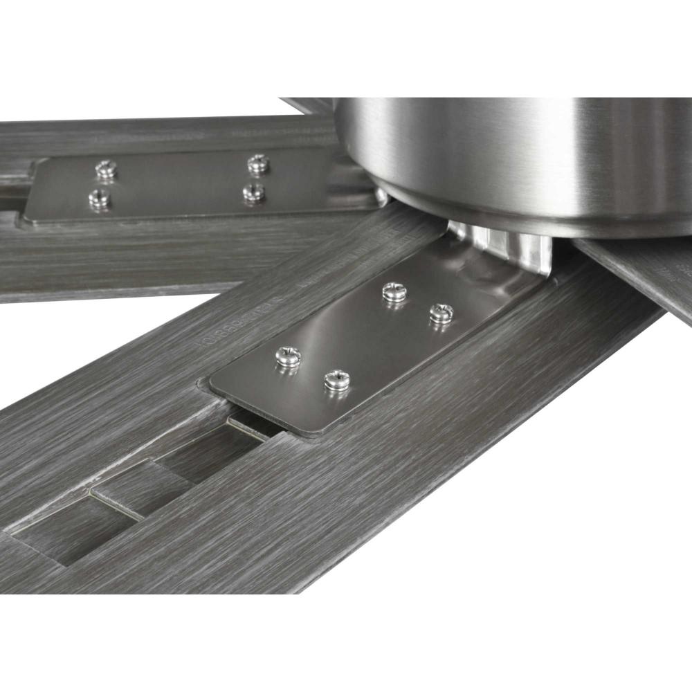 The fan is finished in subtle brushed nickel complemented by six all-weather ABS blades in grey weathered wood finish