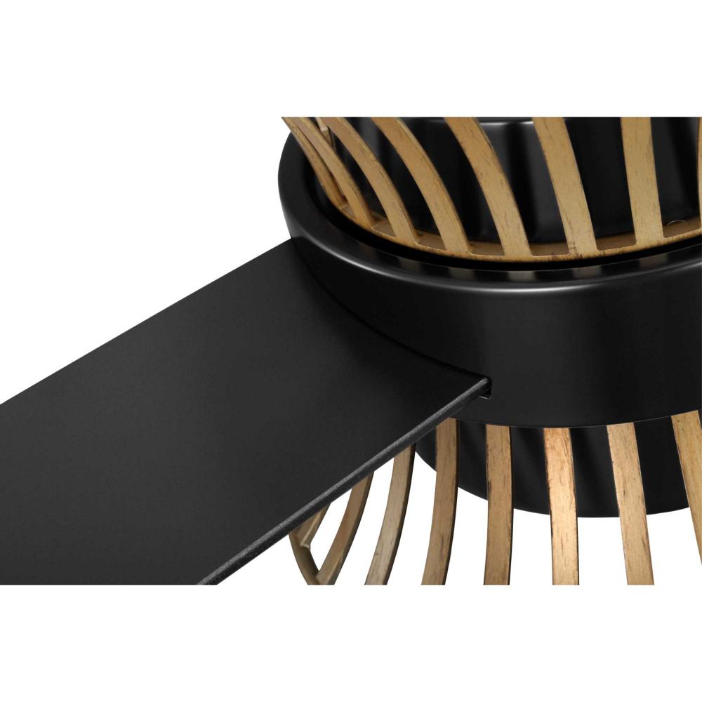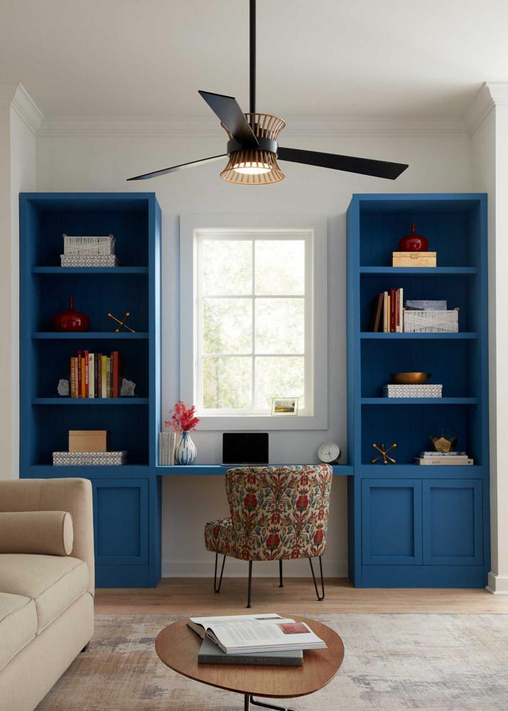 Three plywood fan blades surround a woven cage detail, accenting organic and global rooms