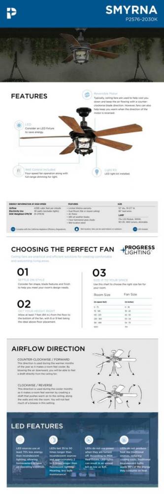 52" Smyrna ceiling fan features five blades and an LED light source, offering both form and function with energy- and cost-savings benefits;The light kit contains a clear hammered glass shade and contains a 17W dimmable 3000K LED module with 90CRI and