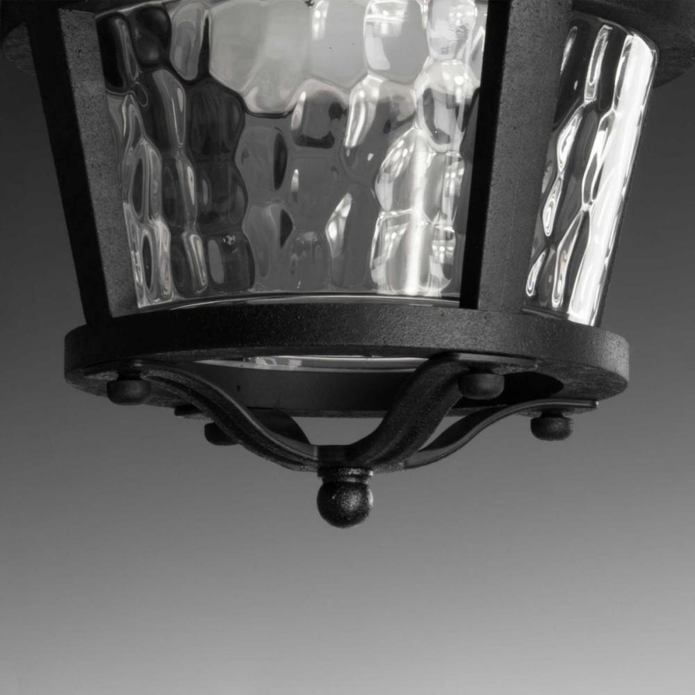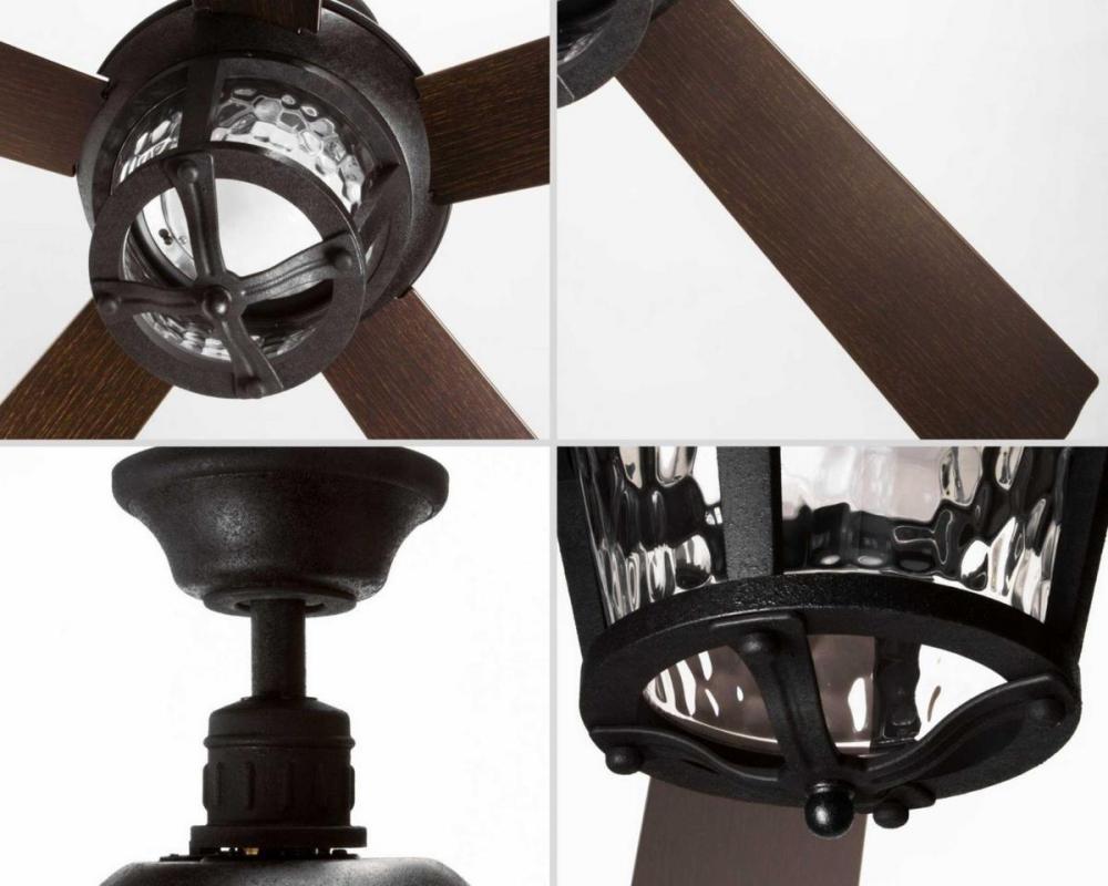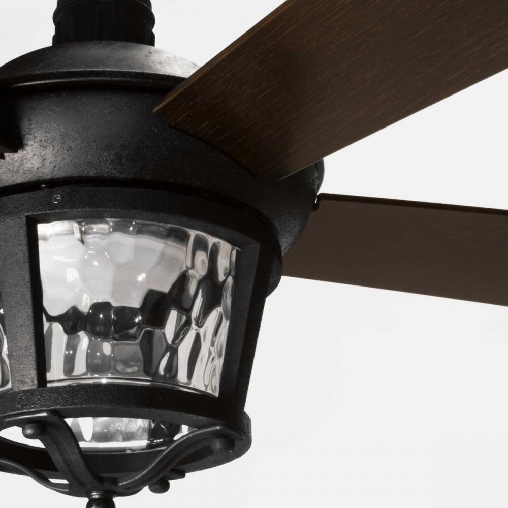 This 52 inch Smyrna ceiling fan features a Forged Black finish with toasted oak blades. The LED light source offers both form and function with energy- and cost-savings benefits. The light kit contains a clear hammered glass shade and contains a 17W dimmable 3000K LED module. A wall switch is included. The five-blade fan features a dual mount system and has an all weather wet location rating (ABS) to accommodate a variety of settings inside and outside of the home. Smyrna is available in two finish options: Antique Bronze and Forged Black.