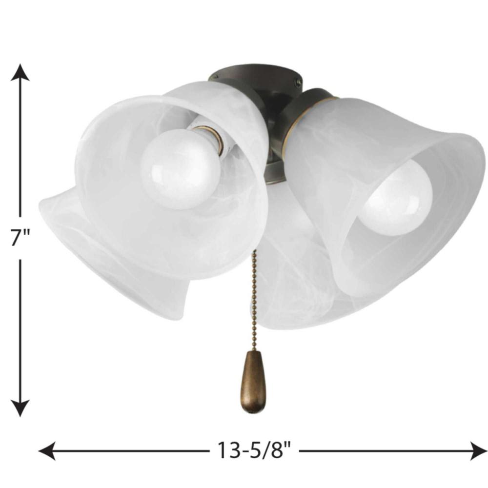 Add style and light to your ceiling fan with this universal fan light kit.;Alabaster style glass shades;Antique Brass pull chain/ w medium oak fob included.;Quick-connect wiring to any progress fan that accept an accessory light.;Includes four 3000K, 800 l