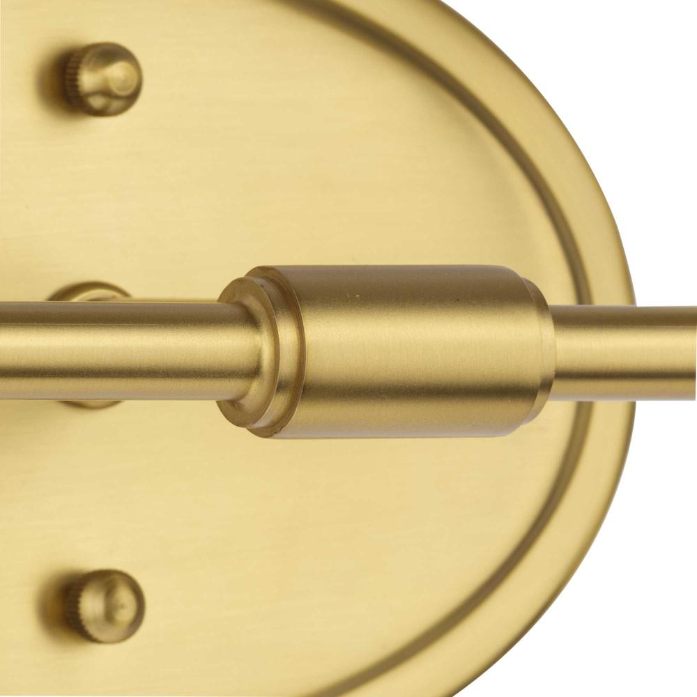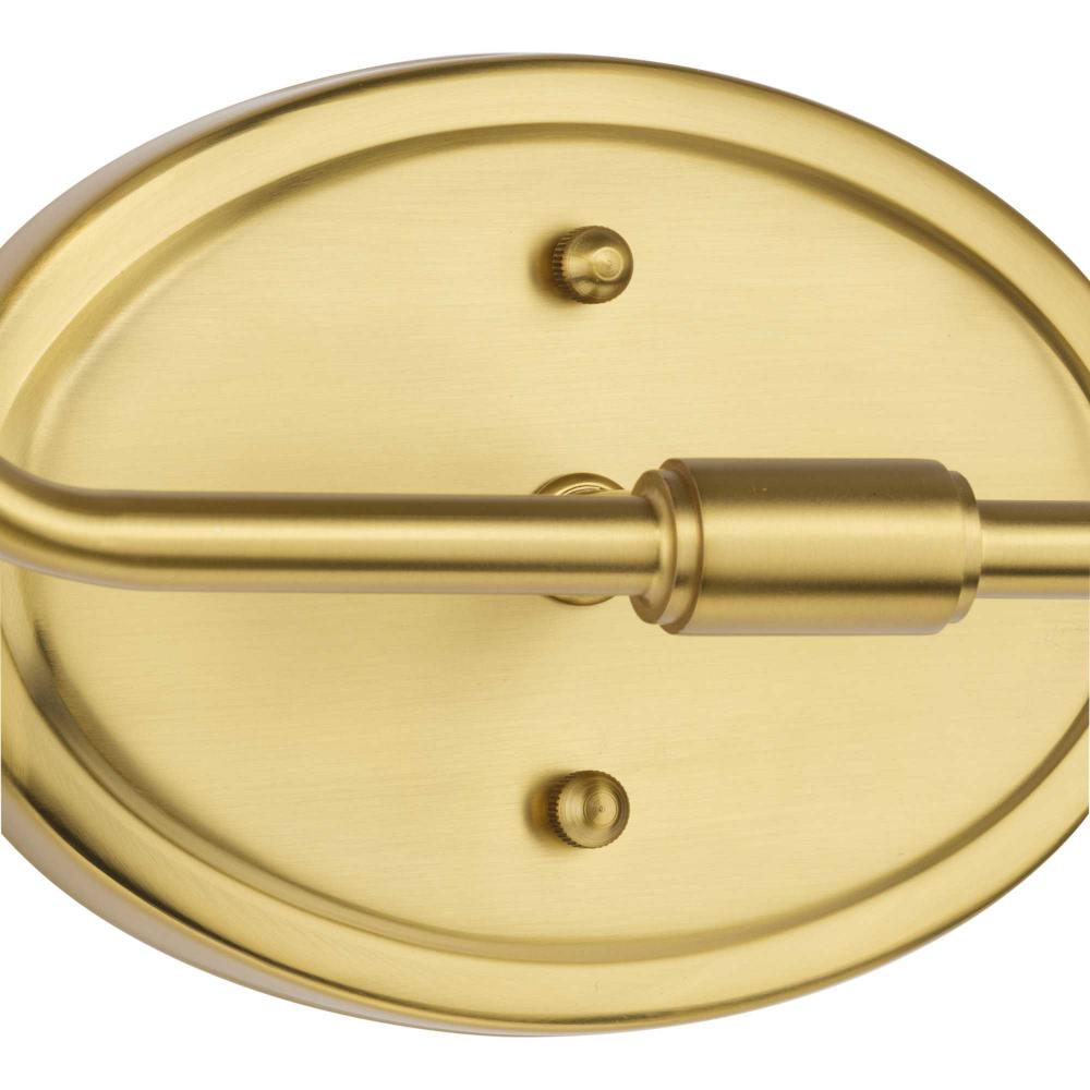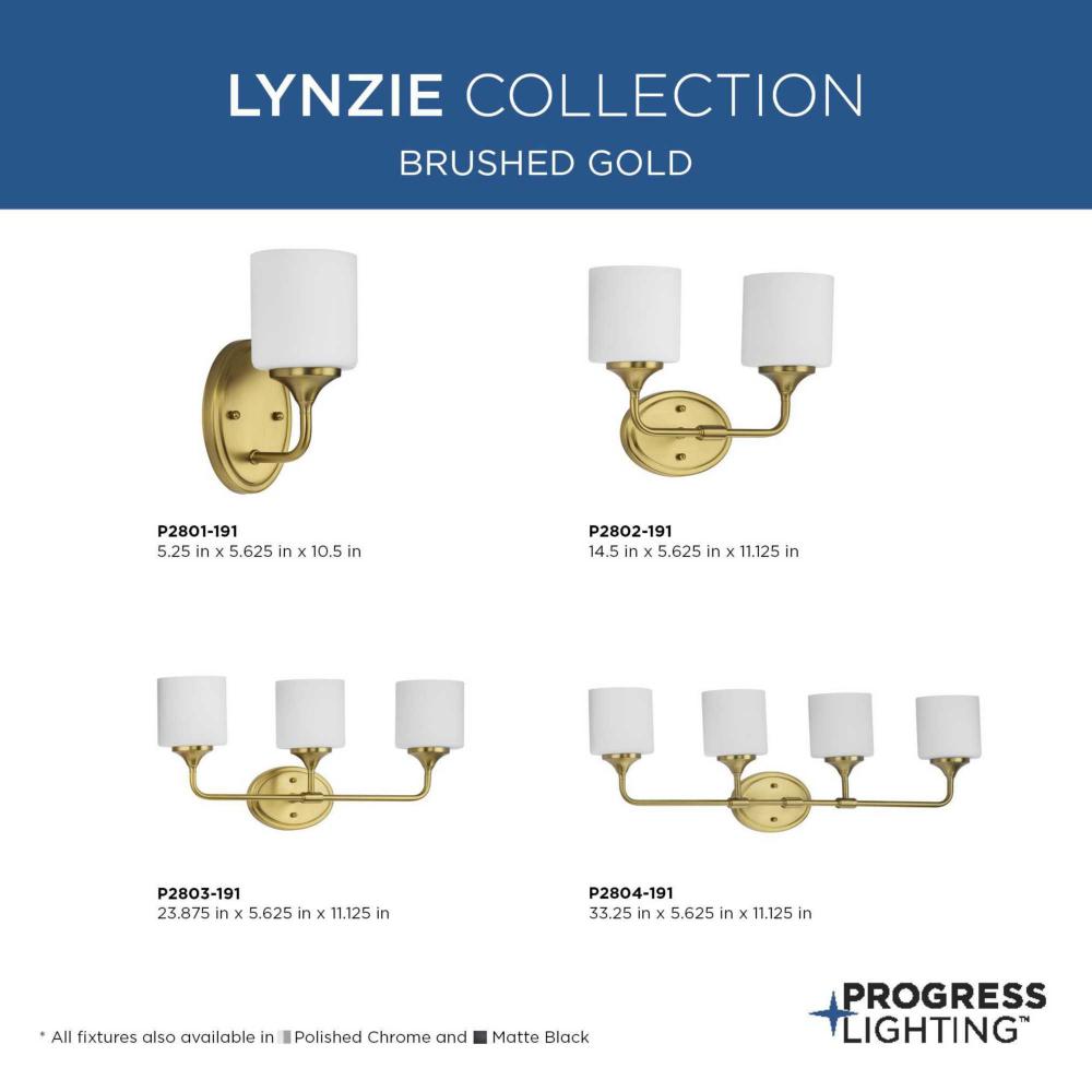 With a youthful, yet timeless flair, the Lynzie Collection brightens your day with its elegant form. Two etched white, oval shaped glass shades are held upright by delicate arms attached to a classic oval backplate coated in a brushed gold finish. Uncluttered and simple lines depict the gracefulness of this bath vanity collection and add visual interest without complexity. Ideal for a bathroom, hallway, or foyer in modern or transitional style settings, this versatile design can be mounted with the glass facing up or down for more design flexibility.