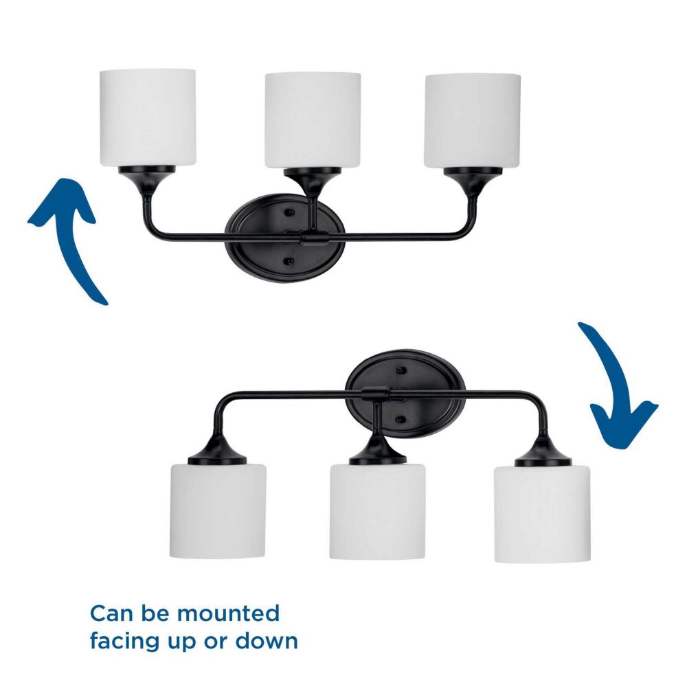 With a youthful, yet timeless flair, the Lynzie Collection brightens your day with its elegant form. Three etched white, oval shaped glass shades are held upright by delicate arms attached to a classic oval backplate coated in a matte black finish. Uncluttered and simple lines depict the gracefulness of this bath vanity collection and add visual interest without complexity. Ideal for a bathroom, hallway, or foyer in modern or transitional style settings, this versatile design can be mounted with the glass facing up or down for more design flexibility.