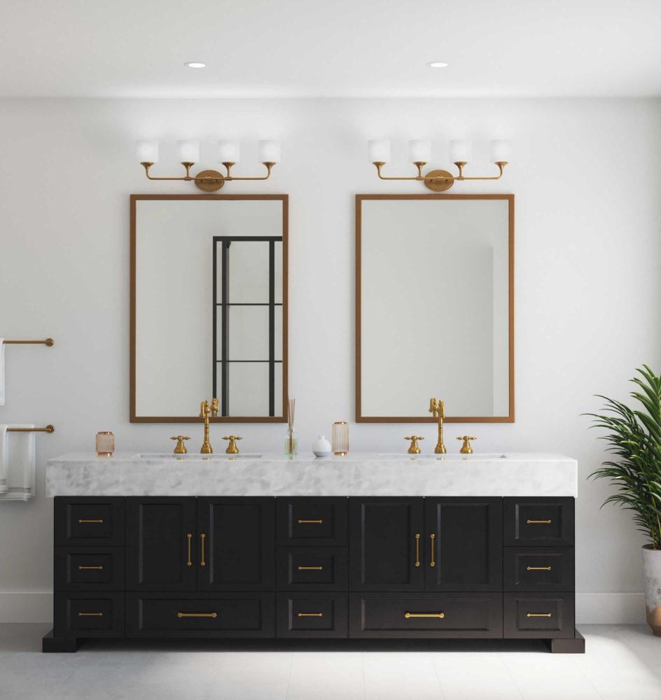 With a youthful, yet timeless flair, the Lynzie Collection brightens your day with its elegant form. Four etched white, oval shaped glass shades are held upright by delicate arms attached to a classic oval backplate coated in a brushed gold finish. Uncluttered and simple lines depict the gracefulness of this bath vanity collection and add visual interest without complexity. Ideal for a bathroom, hallway, or foyer in modern or transitional style settings, this versatile design can be mounted with the glass facing up or down for more design flexibility.