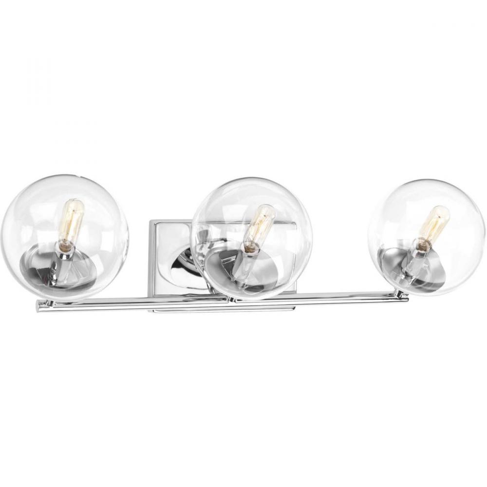 Giving a nod to the space age with mid-century modern appeal, Mod features a sleek linear frame in a Polished Chrome finish. Clear, spherical glass shades offer the perfect focal point for vintage bulbs or reflector-style globes. This three-light fixture can be used in the bath and vanity works with wide variety of styles.