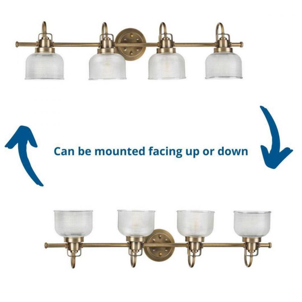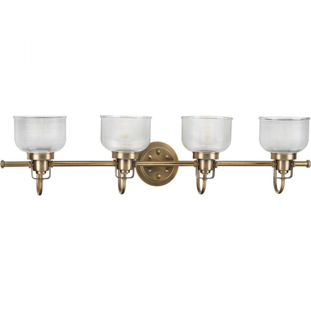 Opt for stronger focused light illumination with the impressive Archie four-light bath. Four refined, double-prismatic glass shades hang shoulder to shoulder, each supported by its own curved arm. A single, straight bar supports the light sources and fuses the entire structure to a circular backplate. With its Vintage Brass finish, the fixture is perfect for inspiring an old-world feel as it brightens a bathroom or dressing table mirror, a hallway, or wherever focused light is called upon in farmhouse and transitional interiors.