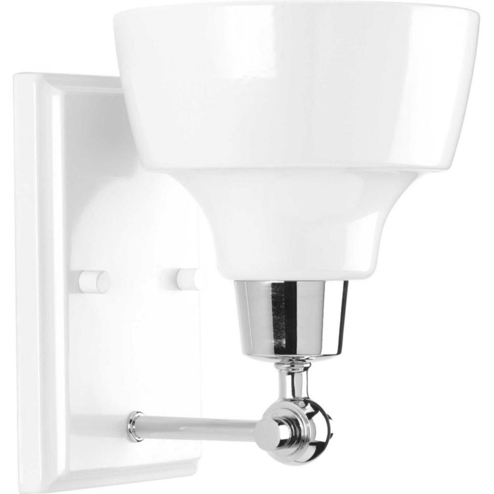 Ideal for a bathroom, hall, or foyer;Perfect for coastal, farmhouse, and urban industrial style settings;Gloss white with crisp polished chrome accents;Crisp white metal shade;Mount the light fixture facing up or down;Use 1 medium base bulb that is sold se